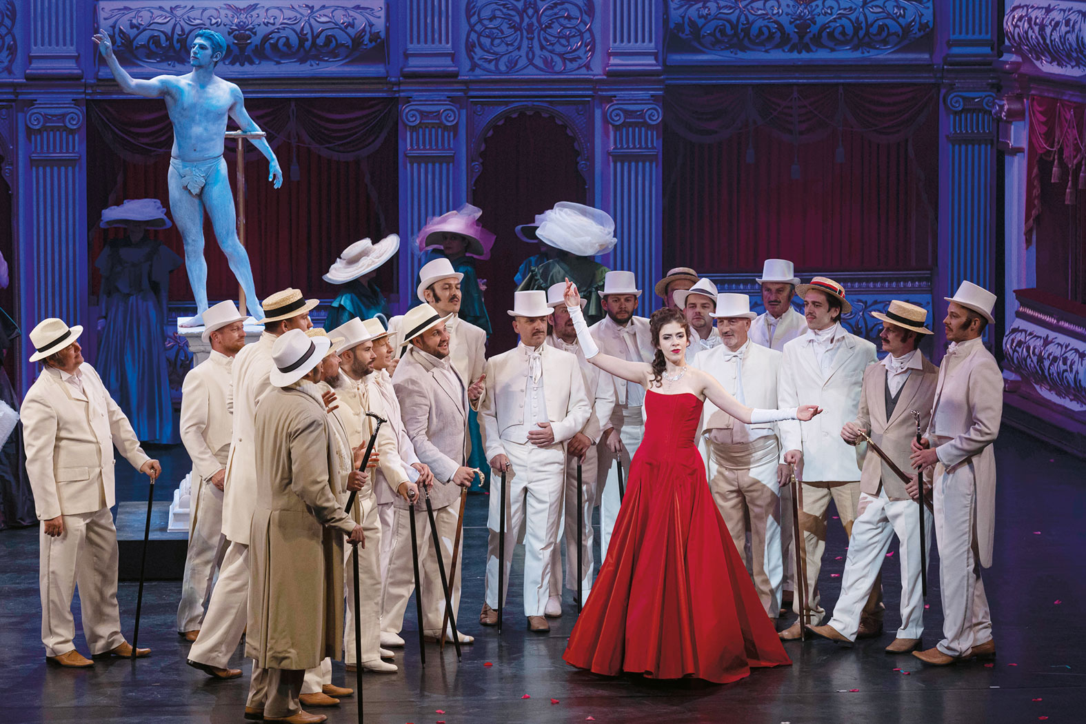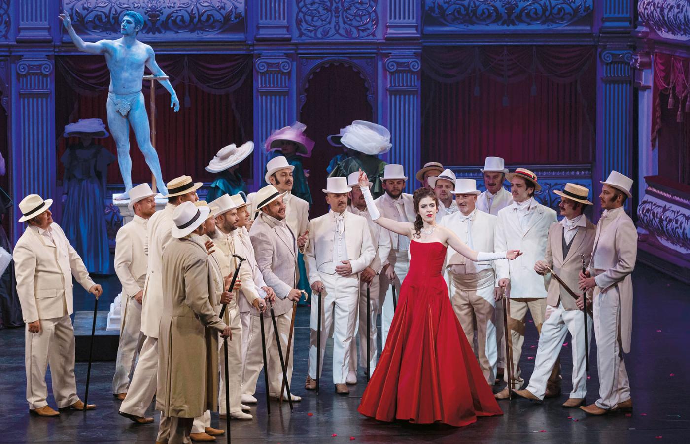 Pierwszy raz od dawna pojawiła się na wrocławskiej scenie realizacja goszczącego tu niegdyś częściej Waldemara Zawodzińskiego ze swoim teamem, czyli Janiną Niesobską (choreografia) i Marią Balcerek (kostiumy). Wiadomo więc było, że pomysł będzie dopracowany i barwny. I jest, dość zaskakujący: po podniesieniu kurtyny widzimy jakby odbicie widowni opery, z tymi samymi balkonami i wystrojem. Wszystko jest więc jakby wzięte w dodatkowy nawias.