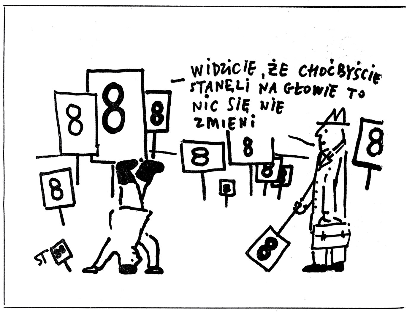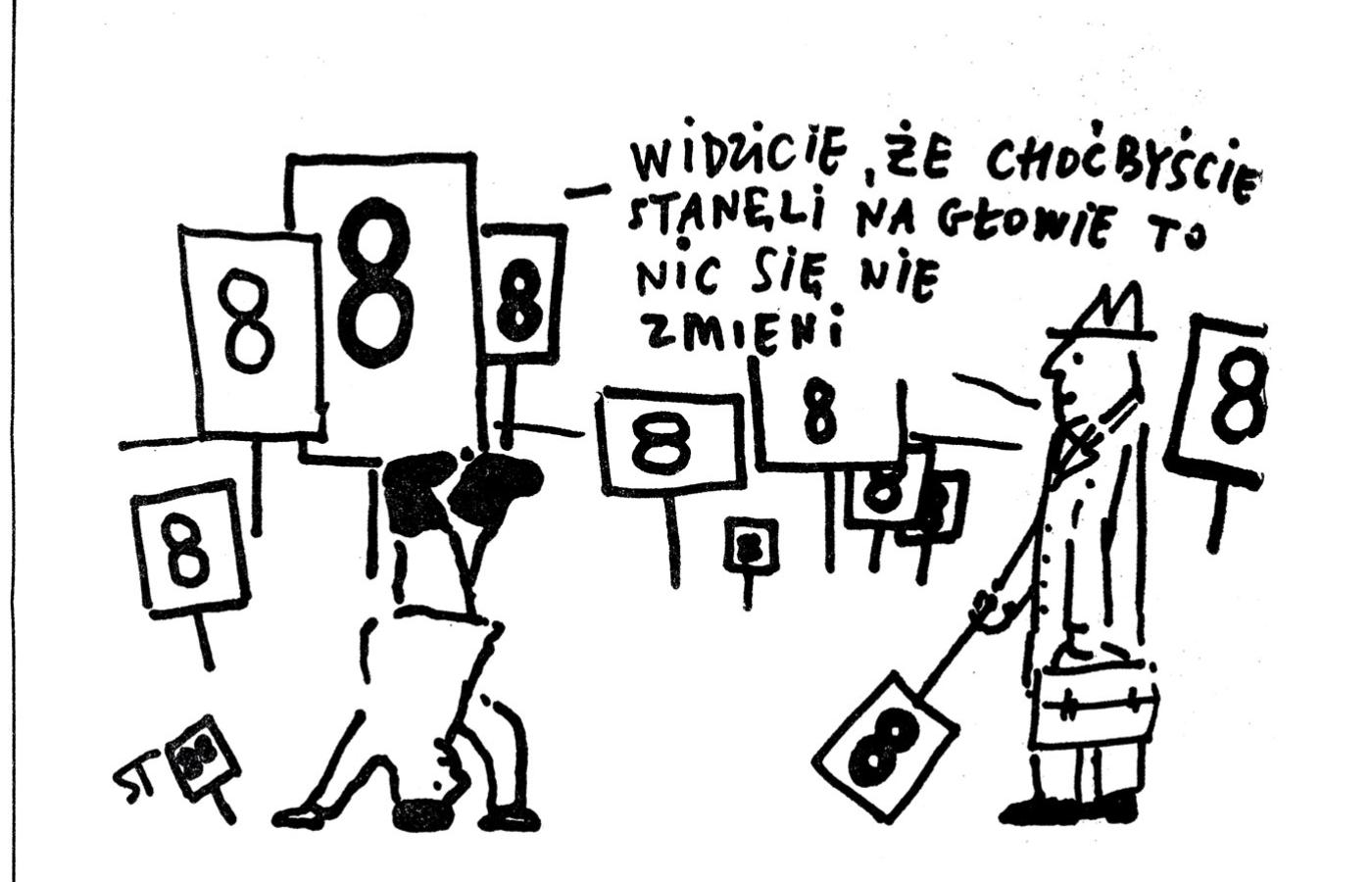Człowiek wielu profesji i zajęć, choć jakoś tam spokrewnionych, czyli reżyser, aktor, felietonista i scenarzysta, tym razem ujawnia stosunkowo mniej znaną swoją twarz: autora rysunków satyrycznych. Pochodzą zasadniczo z dwóch okresów. Po pierwsze, z końca lat 80. XX w., gdy ozdabiały jego felietony w „Tygodniku Kulturalnym”, i z początków XXI w., gdy ilustrowały „Fotel” – dodatek satyryczny redagowany przez Tyma dla „Rzeczpospolitej”. Większość tych prac podszyta jest polityką i ideologią czy może raczej absurdami przez nie generowanymi. Tym jednak rzadko wali satyrą po oczach, a bliżej mu raczej do mistrzów rysunkowej metafory, jak Sławomir Mrożek czy Szymon Kobyliński. Jak w rysunku, na którym facet stojący pośrodku pustyni i lustrujący horyzont przez lornetkę stwierdza: „Też nic nie widać, ale dużo wyraźniej”. Owa ponadczasowość rysunków Tyma sprawia, że co rusz czyta się z niedowierzaniem daty ich powstania, bo wyglądają, jakby opowiadały o tym, co dziś dzieje się wokół nas. Wystawę przygotowano z tzw. kontekstem: są szpalty „Fotela”, oryginalne zdjęcia i plakaty z STS oraz teksty skeczy z kabaretu Dudek, bo z obydwoma tymi legendarnymi instytucjami autor współpracował. Skromna, ale zajmująca wycieczka w przeszłość, która, okazuje się, wcale nie jest odległa.