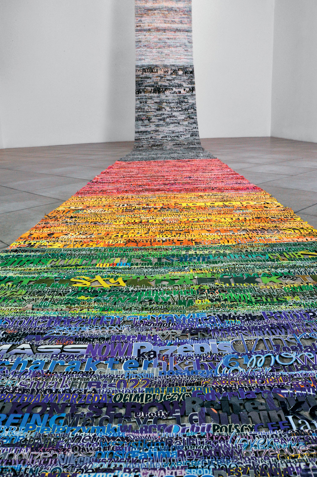 Dziesięć lat temu Katarzyna Józefowicz otrzymała Paszport POLITYKI i – patrząc na orońską retrospektywę – można zaryzykować opinię, że jej sztuka nie zmieniła się od tego czasu ani o jotę. Oczywiście powstawały nowe prace niepodobne do poprzednich, bo nie w powielaniu leży tu sedno, ale w autorskiej wizji sztuki jako benedyktyńskiej pracy, traktowanej jako forma osobistej (i osobliwej) medytacji. Z godzinami, tygodniami, miesiącami monotonnych, powtarzalnych zajęć, które skumulowane dają dopiero efekt ostateczny. A tym efektem są prace imponujące nie tylko skalą włożonego w nie wysiłku, ale przede wszystkim przewrotnym efektem, który sprawia, że medialny szum zamieniany jest w ciszę, chaos i mnogość bodźców – w monotonię, słowa – w to, co poza nimi. Józefowicz próbuje opanować gigantyczny strumień informacyjny, który nas zalewa, nie poprzez jego uporządkowanie, ale poprzez zbanalizowanie, a może nawet subtelne ośmieszenie. Artystka podąża ścieżką indywidualną i daje wiarę, że nawet wobec zjawisk, które nas przerastają i napawają lękiem, możemy nabrać zdrowego dystansu.