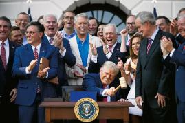 Trump podpisał ustawę w atmosferze patriotycznego uniesienia i przy akompaniamencie chórów na jego cześć.