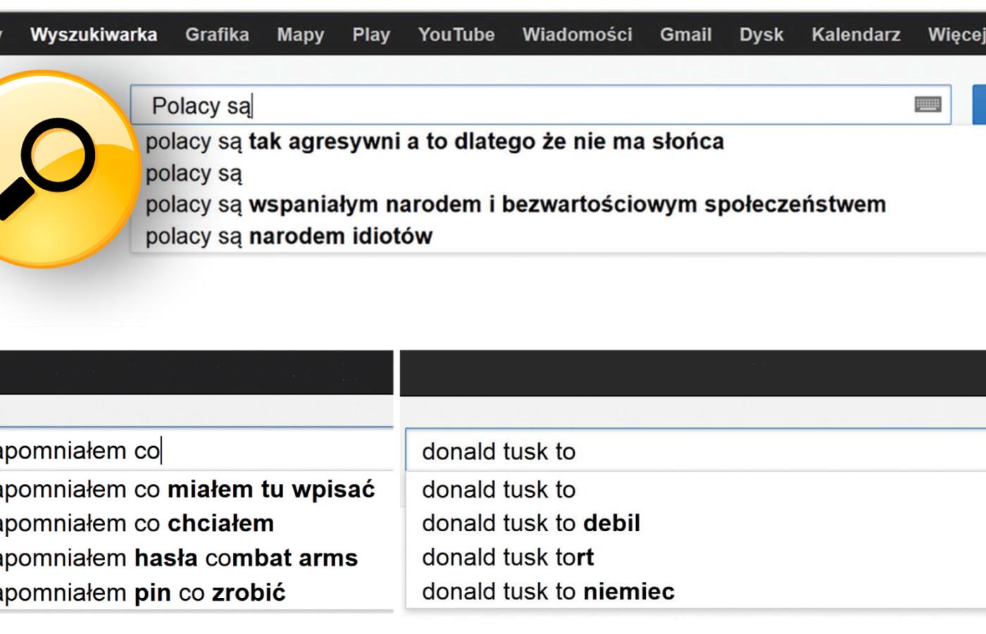 Wszystko to podpowiedziała mi internetowa wyszukiwarka Google. Uwaga: zanim jeszcze kliknąłem przycisk „szukaj”. Wystarczy wpisać imię i nazwisko znanego polityka albo nazwę dowolnego państwa wraz ze słówkiem „to”, „jest”, ewentualnie angielskim „is/are”, by niepozorne okienko wyświetliło sugestie dotyczące danej osoby czy narodu. Sugestie, które można uznać za najszerzej zakrojone i najbardziej aktualne badania internetowej opinii publicznej. Automatyczne podpowiedzi wyszukiwarek – bo to one podsunęły mi powyższe prawdy o świecie – wiernie odzwierciedlają bowiem nasze własne poczynania w sieci.