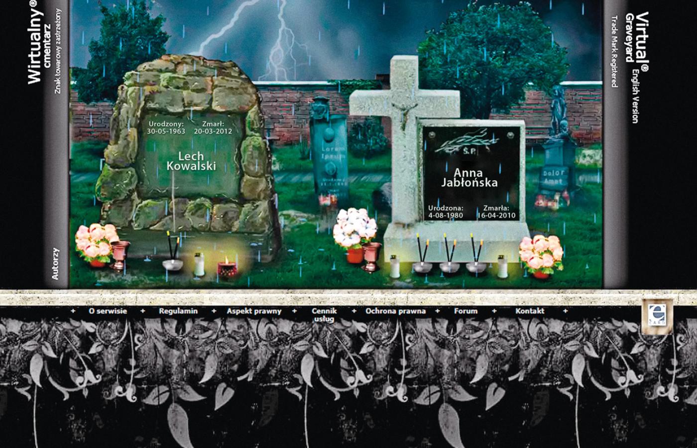 Stoją nagrobki niezamieszkane. Ci, którzy czują zażyłość z nieaktywnym, mogą zamówić u grafika kwaterę podwójną. Albo rodzinną. Na wirtualnym cmentarzu swoich bliskich często e-chowają już podupadłe na siłach, ale jeszcze żywotne cyfrowo staruszki (groby poległych we wrześniu 1939 r. są zwolnione z opłat). W zasięgu kciuka mają też sklep. Wiązanka/znicz jednodobowy – gratis, kwitnąca/płonący 30 dni – 9 zł.