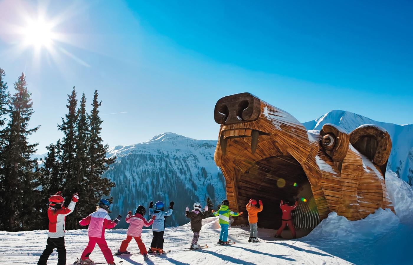 Faktycznie, pomysłów jest tu mnóstwo. Są choćby żłobki dla nawet trzymiesięcznych niemowląt (czynne także wieczorem). Dzieci do narciarskich przedszkoli i szkółek odbierane są z różnych miejsc stacji – by rodzice nie musieli dowozić ich za daleko. Instruktorzy, przeszkoleni z metodologii nauczania najmłodszych, prócz standardowego w Alpach wyposażenia (taśmowe wyciągi z przeciwwiatrowymi osłonami, specjalnie formowane w celu ułatwienia skrętów tory, karuzele, trampoliny itd.), mają do dyspozycji szlaki przygodowe. Mogą zabrać podopiecznych na pełne emocji wyprawy Drogą Niedźwiedzią (wśród przeszkód terenowych jest przejazd przez paszczę wielkiego drewnianego miśka), do Puszczy Dinozaurów czy Świata Jaskiń. Trasy są tak pomyślane, by dzieci przez zabawę uczyły się nie tylko techniki jazdy, ale też reakcji na niespodziewane sytuacje (nieoczekiwane dźwięki bądź przeszkody terenowe), a nadto poznawały góry i przyrodę.