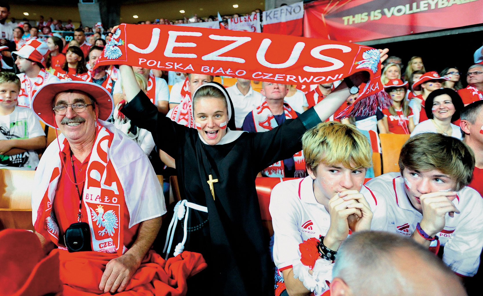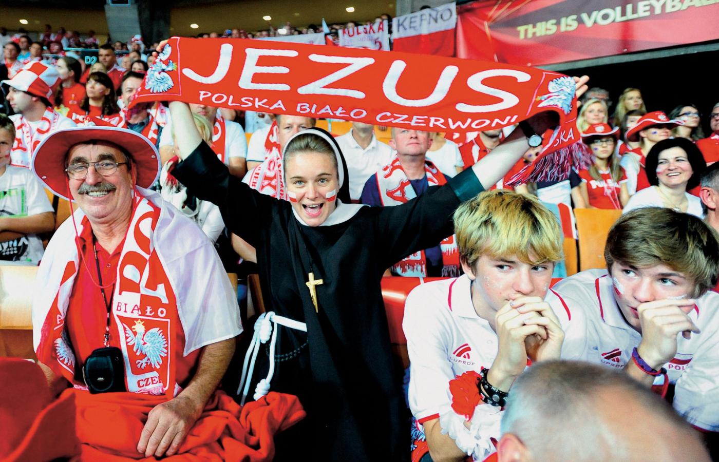 Mirosław, 44-latek z Wrocławia, prywatny przedsiębiorca, akurat nie ma szalika, peruki, irokeza, rogów, flagi ani koszulki w barwach narodowych (ma za to zakazaną odgórnie podczas meczów trąbkę, w którą dmie bez opamiętania, podczas prezentacji składu polskiej reprezentacji), bo uważa, że to afiszowanie się z polskością w warstwie odzieżowo-gadżetowej jest nieco pretensjonalne. – Naprawdę ważna jest świadomość, że siatkówka to jest wspólna sprawa. Zawodników i kibiców. Poza tym podoba mi się wytworzona tu przestrzeń do demonstrowania polskości. Nie chodzę na marsze z okazji Święta Niepodległości, nie wywieszam flagi przed domem, ale gdy tu brzmi hymn, mam dreszcze. I śpiewam na całe gardło – przyznaje.