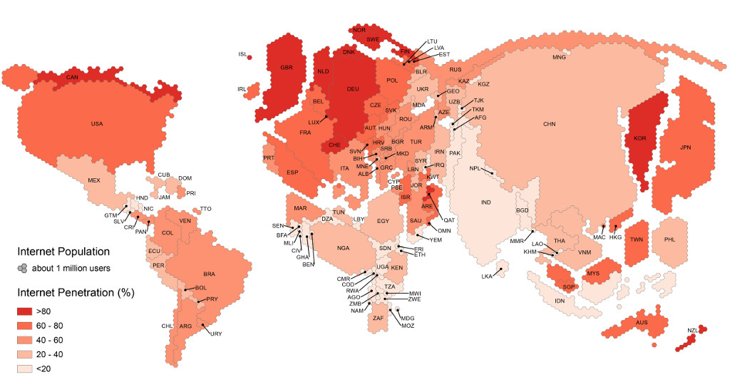 Badacze z Oxford Internet Institute stworzyli mapę świata, na której rozmiar kraju nie odzwierciedla jego powierzchni, lecz liczbę internautów.