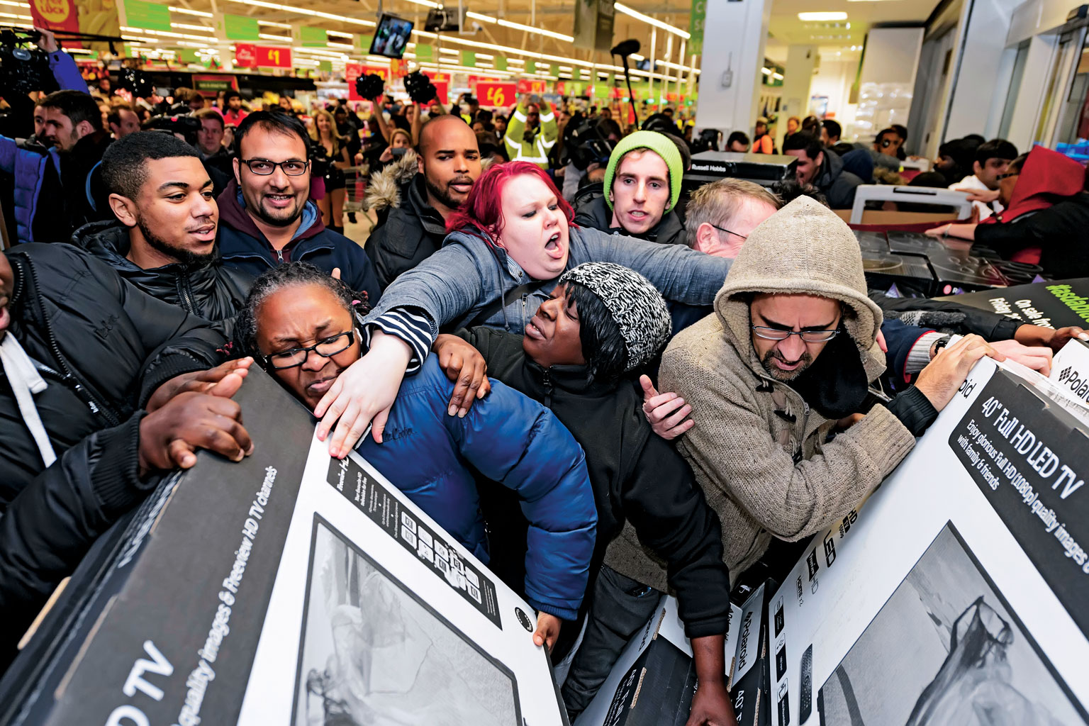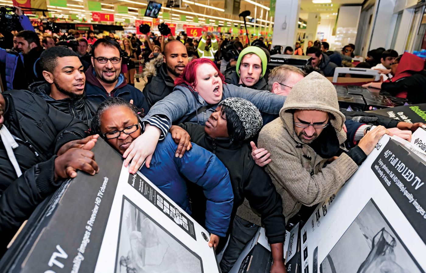Po otwarciu drzwi ludzie rzucają się do stoisk biegiem, rozpychając się i przewracając słabszych. Pękają szyby i puszczają wyważane z zawiasów drzwi. W 2008 r. w Walmarcie w małym miasteczku w stanie New York tłum stratował na śmierć pracownika sklepu. W tym roku dwie kobiety pobiły się o lalkę Barbie. W jednym z supermarketów mężczyzna uderzył interweniującego policjanta.