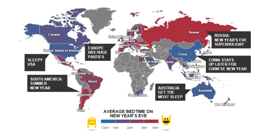 Badacze podają z dokładnością do minuty, o której godzinie mieszkańcy różnych państw świata decydują się wrócić do łóżek w sylwestrową noc. Najlepiej świętować w Europie i Południowej Afryce – podpowiadają – bo tam zabawa trwa najdłużej. A jeszcze lepiej zdecydować się na podróż do Argentyny, Brazylii lub Chile – noc sylwestrowa kończy się tam późno i nie jest mroźna, bo trwa lato.