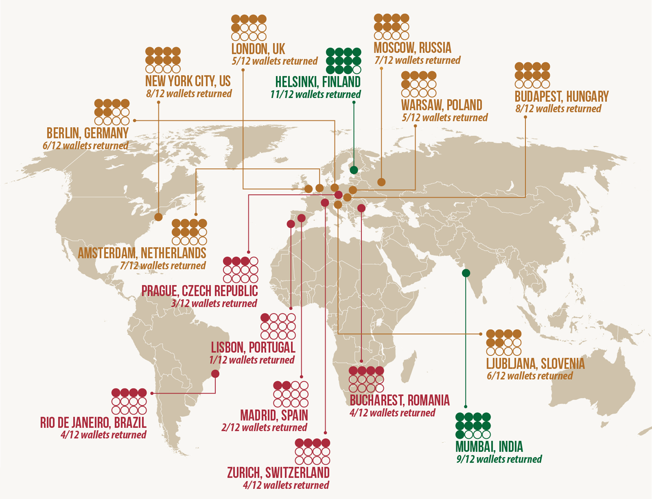 Miasta oznaczone na zielono to te najuczciwsze. Potwierdziła się obiegowa opinia na temat fińskiej uczciwości – w Helsinkach tylko jeden portfel nie wrócił do właściciela. „Finowie są z natury uczciwi, to dla nas typowe. Tworzymy małą, cichą i solidarną społeczność – wyznała 27-letnia Lasse Luomakoski, jedna z osób, które portfel zwróciły. – Mamy niewielki kłopot z korupcją, nie zdarza nam się nawet przejeżdżać na czerwonym świetle”.