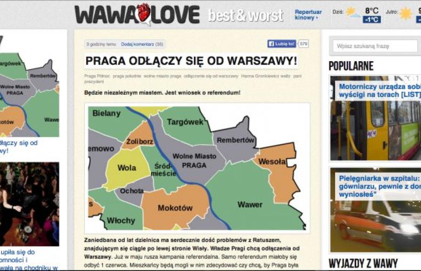 W ubiegłym roku portal wawalove.pl doniósł, że warszawska Praga, dotychczas zaniedbywana na rzecz lewobrzeżnej części miasta, chce odłączenia się od stolicy. Kampania referendalna miała ruszyć w maju, a samo referendum miało się odbyć 1 czerwca. W związku z perspektywą referendum władze Warszawy miały też przenieść na lewą stronę Ogród Zoologiczny.