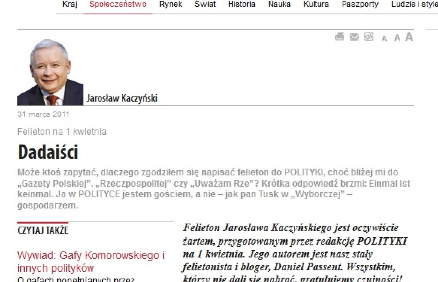 – Może ktoś zapytać, dlaczego zgodziłem się napisać felieton do POLITYKI, choć bliżej mi do „Gazety Polskiej”, „Rzeczpospolitej” czy „Uważam Rze”? Krótka odpowiedź brzmi: Einmal ist keinmal. Ja w POLITYCE jestem gościem, a nie – jak pan Tusk w „Wyborczej” – gospodarzem – tłumaczył w swoim felietonie współpracę z tygodnikiem Jarosław Kaczyński. Wytłumaczenie, dlaczego prezes PiS zdecydował się na współpracę z pismem, które wielokrotnie krytykował, na tyle ją uwiarygodniło, że wiele redakcji nabrało się na żart. Na szczęście podobało się też prezesowi.