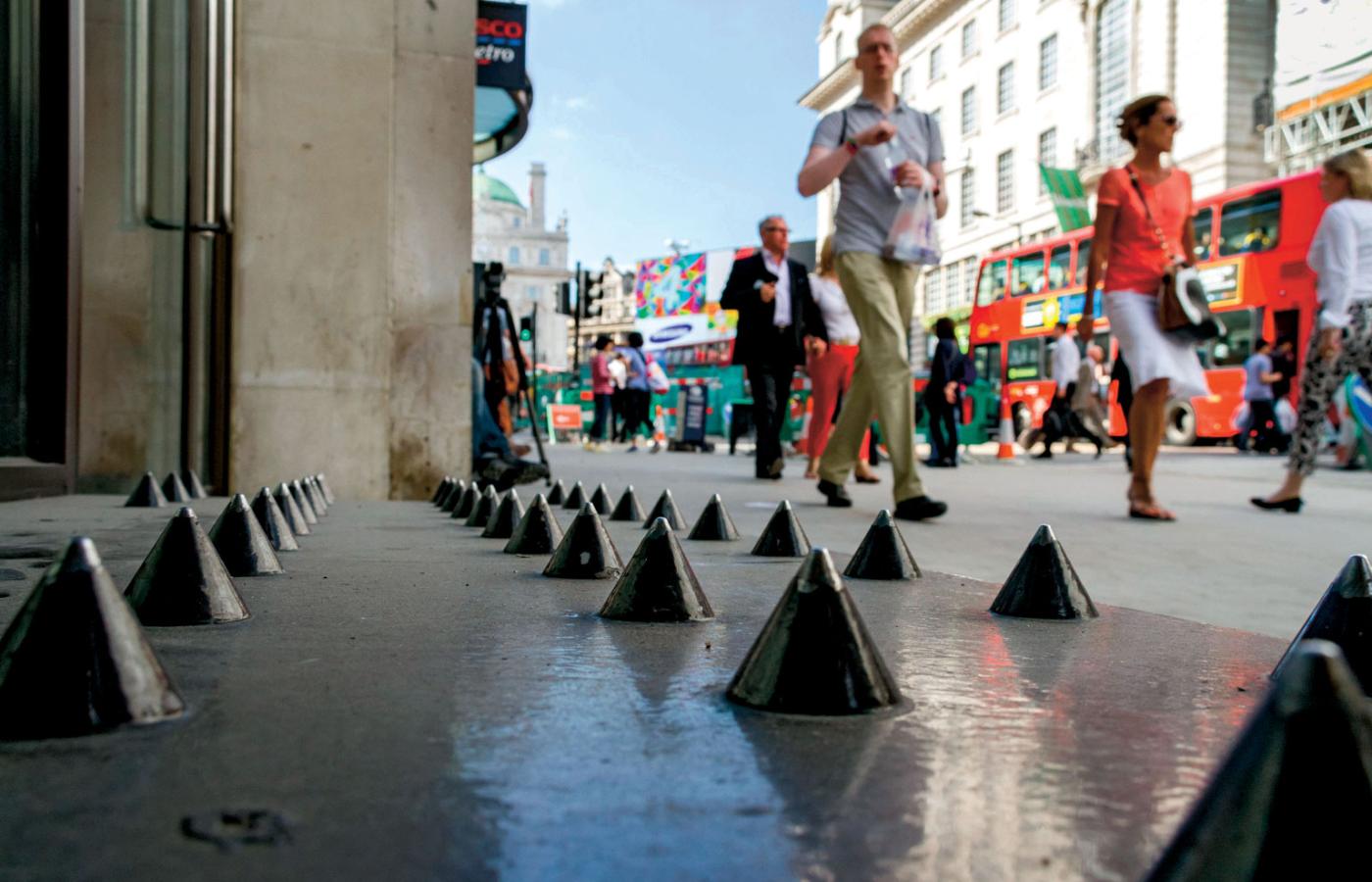 Wmontowane w chodniki kolce czy zraszacze reagujące na ruch z pozoru wyglądają niewinnie. Jednak ich funkcja jest opresyjna i ściśle określona – nie pozwalają rozłożyć się bezdomnym pod prywatnymi i publicznymi budynkami Nowego Jorku czy Hamburga. Urządzenie rozpryskujące wodę zamontowano nawet na schodach prowadzących do katedry w San Francisco, co zresztą wywołało ostatnio falę protestów.