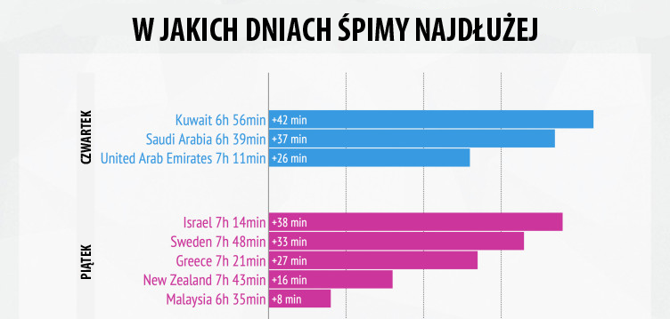 I Polacy folgują sobie na początku weekendu. Z piątku na sobotę przesypiają ok. 7 godz. 24 min (34 min dłużej niż w inne noce).