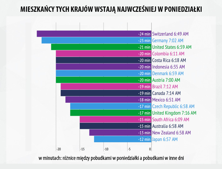 Jako pierwsi wstają mieszkańcy Afryki Południowej – o 6:09, ok. 15 minut wcześniej niż w inne dni tygodnia. Największą różnicę odczuwają zaś Szwajcarzy. Budzą się w poniedziałki o 6:49, w inne pracujące dni tygodnia przeznaczają na sen dodatkowe 24 minuty. Niemcy zaś nastawiają budziki na 7:02, a poza poniedziałkiem nawet na 7:25.