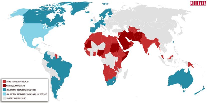 Bywa, że akty homoseksualne nie podlegają karze, ale też nie są prawnie w żaden sposób usankcjonowane (to m.in. przypadek Polski). W części krajów stosuje się najwyższy wymiar kary. W kilkudziesięciu – małżeństwa jednopłciowe są legalne albo legalne tylko pod pewnymi warunkami.