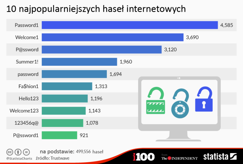 Statista, jeden z największych portali statystycznych, na podstawie pół miliona przypadkowych haseł wyliczył, które z nich powtarzają się najczęściej. Poniższa lista uwzględnia przy tym wyłącznie te hasła, którymi posługują się ludzie biznesu (przedsiębiorcy, właściciele i pracownicy firm). Jak widać, choć pełnią oni często odpowiedzialne funkcje, o właściwą ochronę swoich kont troszczą się już nie zawsze. Ze szkodą dla siebie i firm.