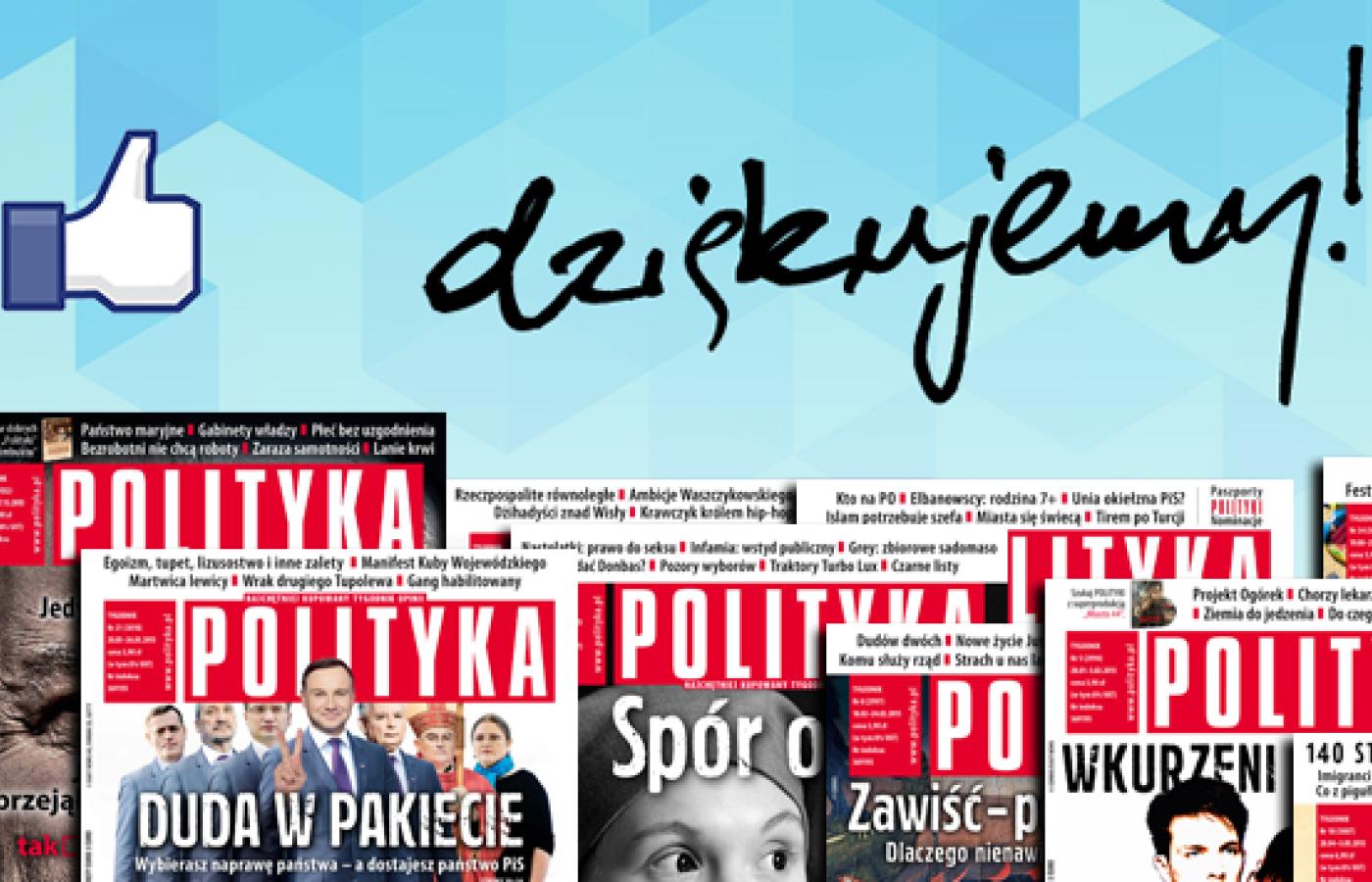 POLITYKA obchodziła w tym roku kilka rocznic. Ważnych – jak wydanie trzytysięcznego numeru. I ciekawych – jak dwudziesty rok naszego tygodnika w kolorze i w nowym, znanym dziś Państwu formacie. 200 tys. fanów na Facebooku należałoby pewnie zaliczyć do tej drugiej kategorii – czyli nie tyle hucznie obchodzić, ile z dumą i przyjemnością odnotować. Z naszych rachub wynika, że czterotysięczny numer POLITYKI ukaże się w 2035 r. O ile Facebook przetrwa, mamy nadzieję, że i wtedy przekroczymy jakiś próg. Może ośmiocyfrowy?