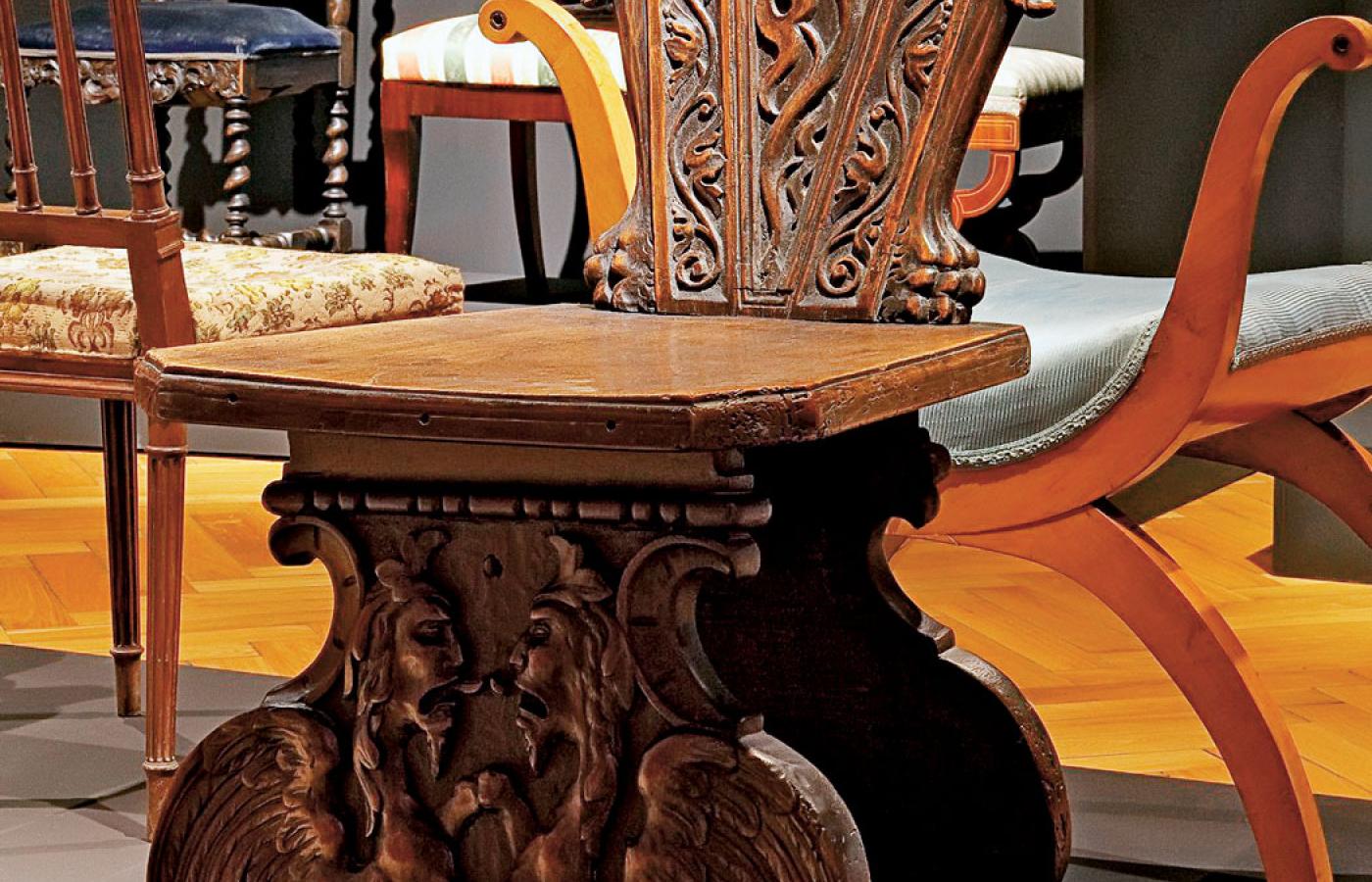 Wrocławska wystawa nieźle dokumentuje ową ścieżkę zmiany stylów i niesłabnący obyczaj wzbogacania siedziska (rzeźbą, intarsją, efektowną materią, fantazyjnymi kształtami), tak by podkreślało pozycję jego właściciela. Wprawdzie w ekspozycji znalazł się tylko jeden obiekt renesansowy (tzw. sgabello wyprodukowane we Włoszech w XVI w.), ale już dalsza historia – od baroku po empire – opowiedziana została licznymi meblami, od dość prostego zydla po bogate pałacowe fotele.