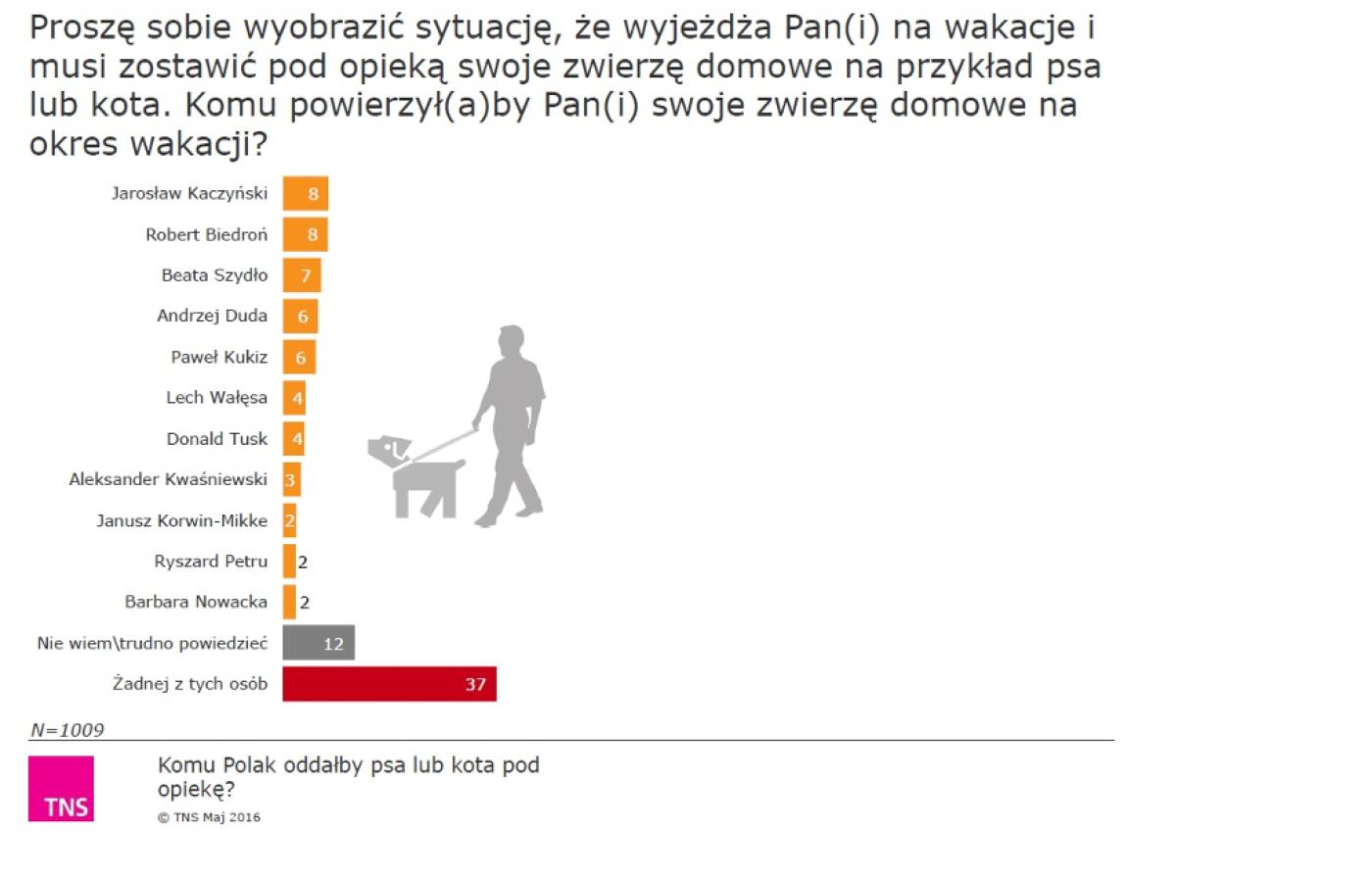 Ponad tysiąc osób usłyszało od ankieterów TNS pytanie: „któremu z polskich polityków powierzyłby Pan/Pani swoje zwierzę domowe na czas swojego urlopu?”. Aż 37 proc. respondentów zgodnie stwierdziło, że żaden z polityków absolutnie nie nadaje się na opiekuna ich pupila.