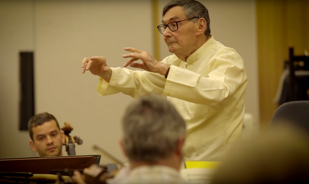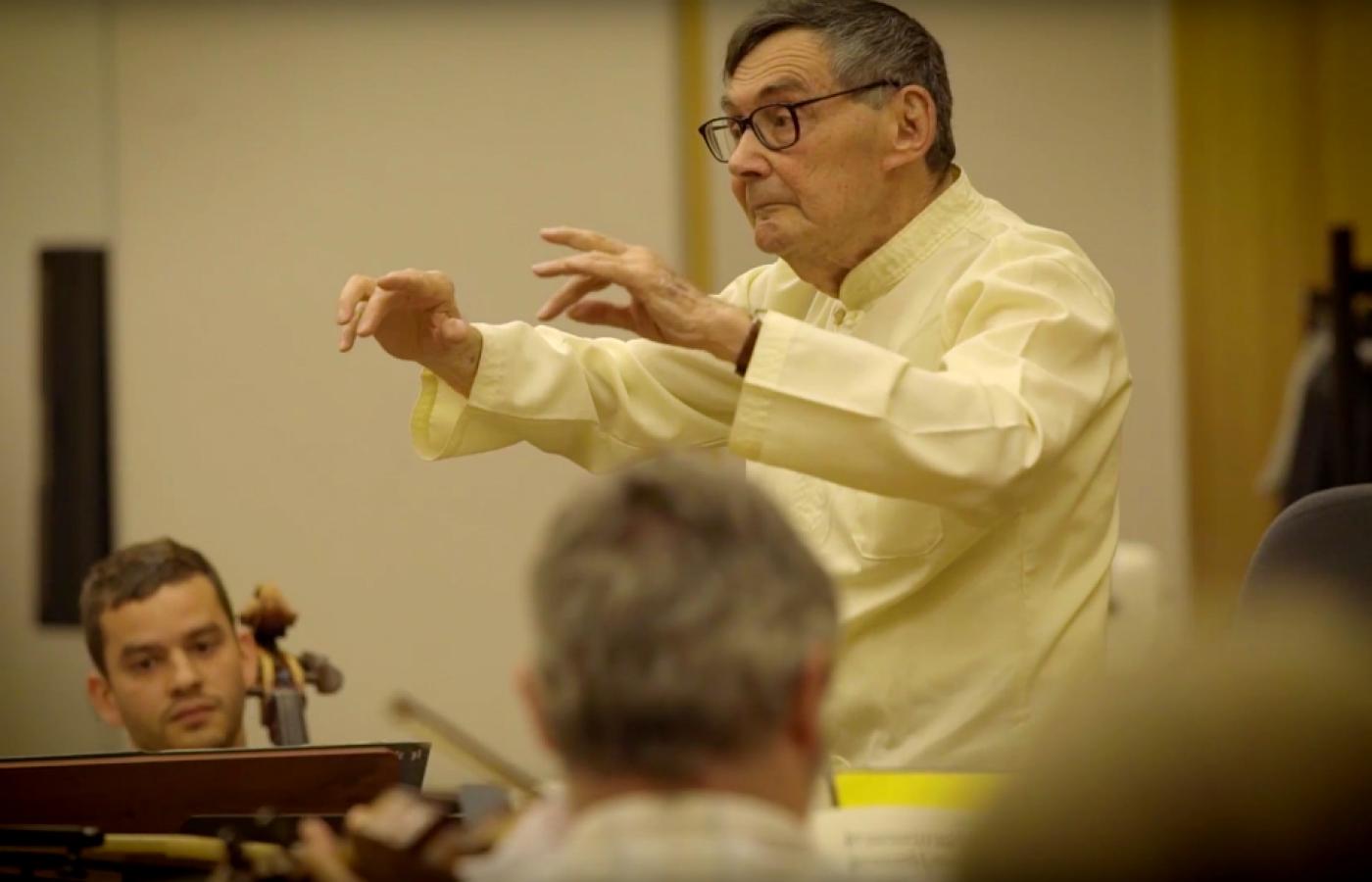 Spełniło się. Marian Turski miał przyjemność dyrygować orkiestrą Sinfonia Varsovia. Towarzyszy mu z dystansu dyrygentka Ewa Strusińska, która zechciała na chwilę – dla Mariana – odstąpić od partytury. Marian nie zrobił z niej jednak szczególnego użytku. Posłuchajcie: