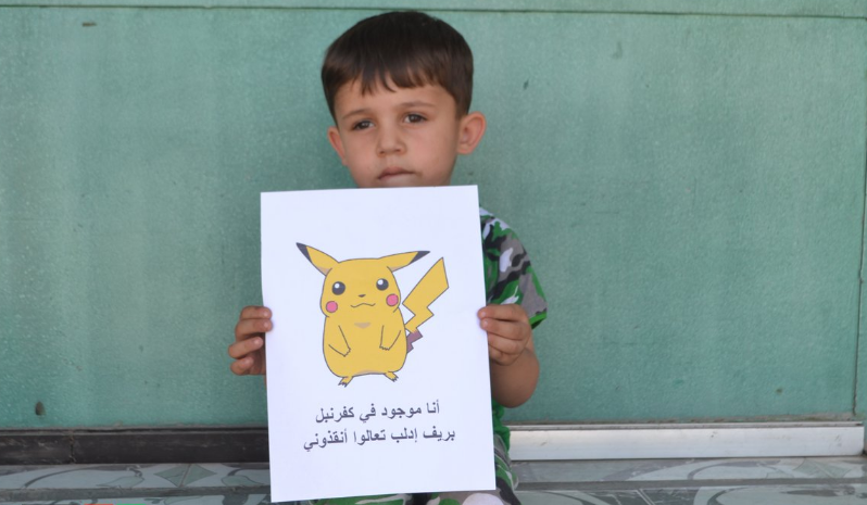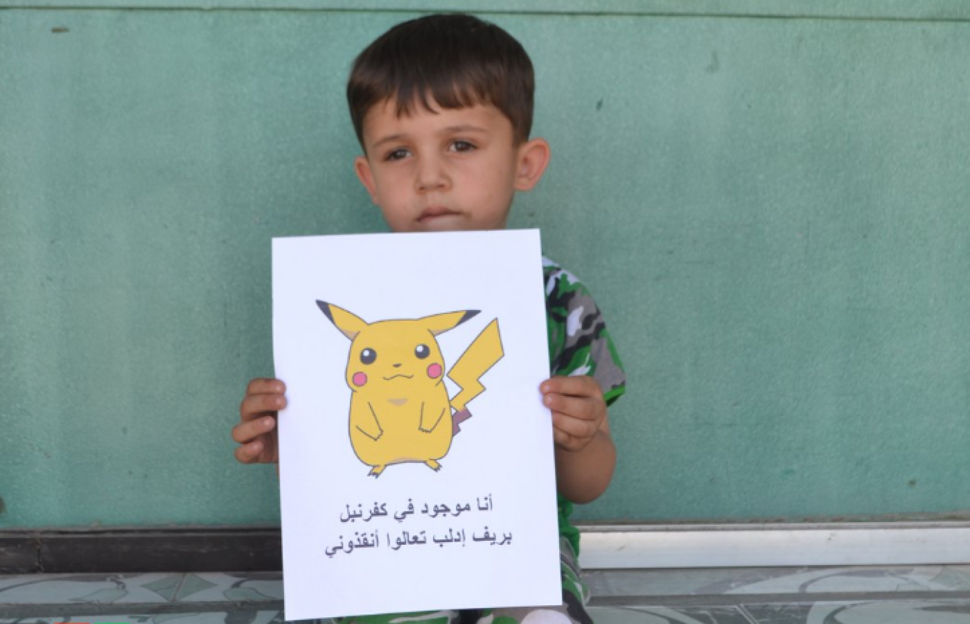 „Jestem Pokémonem, tu w Idlib, czy mógłbyś przyjść i mnie uratować?” – taki apel znalazł się na kartce trzymanej przez kilkuletniego chłopca. Nad prośbą o ratunek jest rysunek Pokémona.