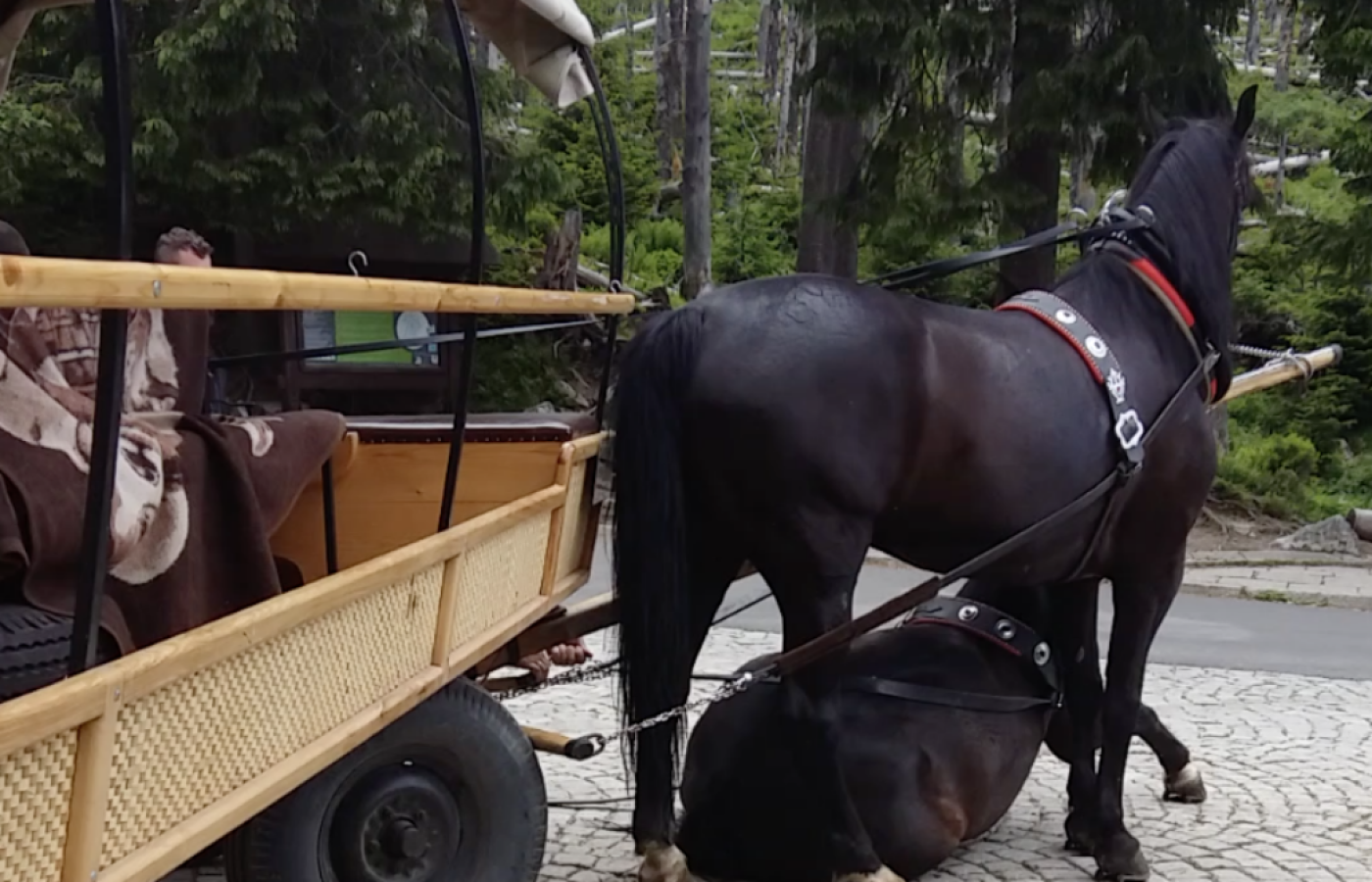 Zwierzęta mają już za sobą męczący kurs w górę, ale teraz muszą wrócić na parking w Palenicy. Są wykończone. Przy próbie ruszenia upada pierwszy koń i przez dłuższą chwilę nie może się podnieść. Furman prosi turystów o opuszczenie wozu, po chwili przewraca się drugi koń. Zwierzę rozpaczliwie próbuje podnieść się na nogi. Wtedy łamie się dyszel od wozu. Do dziś nie wiadomo, jaki był dalszy los wyczerpanych koni.
