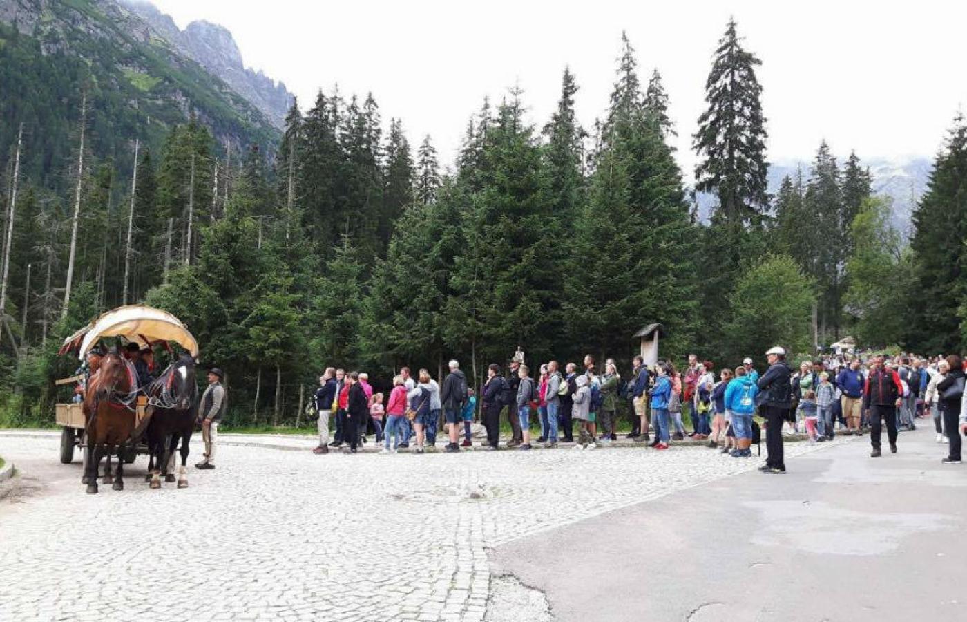 Zakopane, Polana Włosienica. Dwójka karych koni czeka na swój ostatni tego dnia kurs. Zgodnie z regulaminem Tatrzańskiego Parku Narodowego do ciągniętego przez konie powozu może wejść nawet 15 dorosłych osób i piątka dzieci. Bagaży nikt nie liczy, więc każdy może mieć ze sobą tyle toreb, ile zechce.