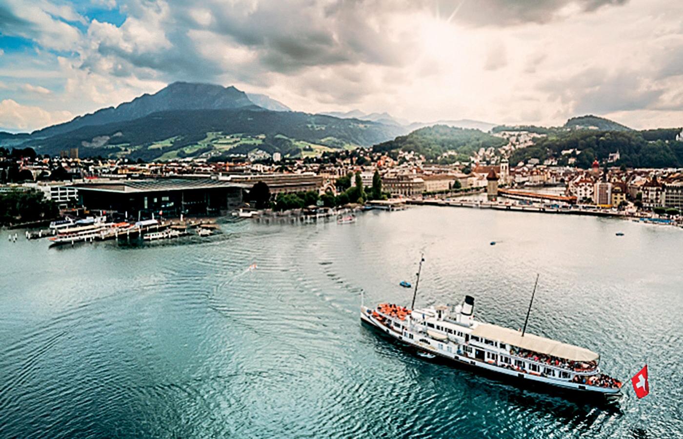 Po wydostaniu się z dworca kolejowego jesteśmy już w zasadzie w sercu miasta i od razu mamy w zasięgu wzroku wszystkie miejsca, do których warto dotrzeć. Na przykład spektakularny, wyrastający ponad miejski horyzont Pilatus (2120 m n.p.m.), może nie najwyższy alpejski masyw górski, ale na pewno jeden z najbardziej stromych. Na samym szczycie, na który dotrzemy np. kolejką (sama podróż – przy tej stromiźnie – okaże się doświadczeniem ekstremalnym), przy dobrej pogodzie doliczymy się 73 innych szczytów. Lucerna leży poza tym nad jeziorem Czterech Kantonów, a jej centrum przecina rzeka Reuss, w której można popływać. A nad wodą duży wybór restauracji z częściowo włoskim menu, choć lokalne specyfiki – jak choćby Älplermagronen, czyli ziemniaki ze startym serem, makaronem i cebulą, czasem też z musem jabłkowym w osobnym naczyniu – też się tutaj odszuka.