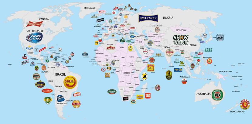 Co nie zmienia faktu, że jeśli wybrać się w podróż dookoła świata piwnym szlakiem, to mapa poniżej mogłaby posłużyć za dość dobry przewodnik. Postudiujcie sami: