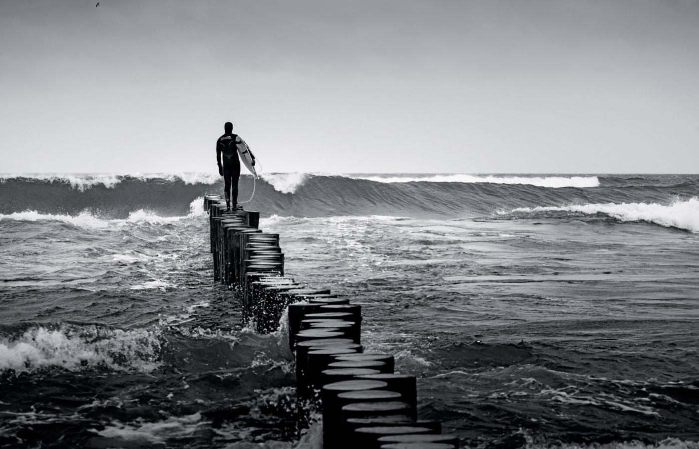 Pierwsi surferzy pojawili się w Chałupach i Władysławowie. – Uczyłem się tam deski podczas sztormów, kiedy nie powinno się wchodzić do wody. Pływałem bez pianki, czasami wychodziłem z wody zielonofioletowy – wspomina Paweł Niesłuchowski. Łukasz Bromski też pływał podczas sztormów. Najczęściej przy porcie we Władysławowie. Na skraju, jak to określa, „pełnej rozpierduchy”. – Kiedyś porwało mnie w pełne morze. Ledwo wróciłem – opowiada Bromski. – Trzymetrowa fala na oceanie może być superspokojna. Taka sama na Bałtyku to bardzo trudne warunki. Dziwne rzeczy dzieją się na tym morzu, bo to płytka, roztrzęsiona balia – mówi surfer. Kiedy Karolina zaczynała pływać na Bałtyku, najczęściej była sama na spocie. – Stałam z deską przed wzburzonym morzem, padał deszcz, wiał silny wiatr. Zastanawiałam się, czy wchodzić. Bo mogłam już nie wyjść – wspomina.