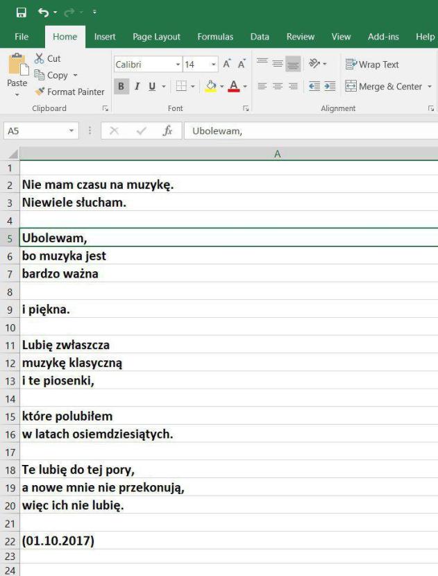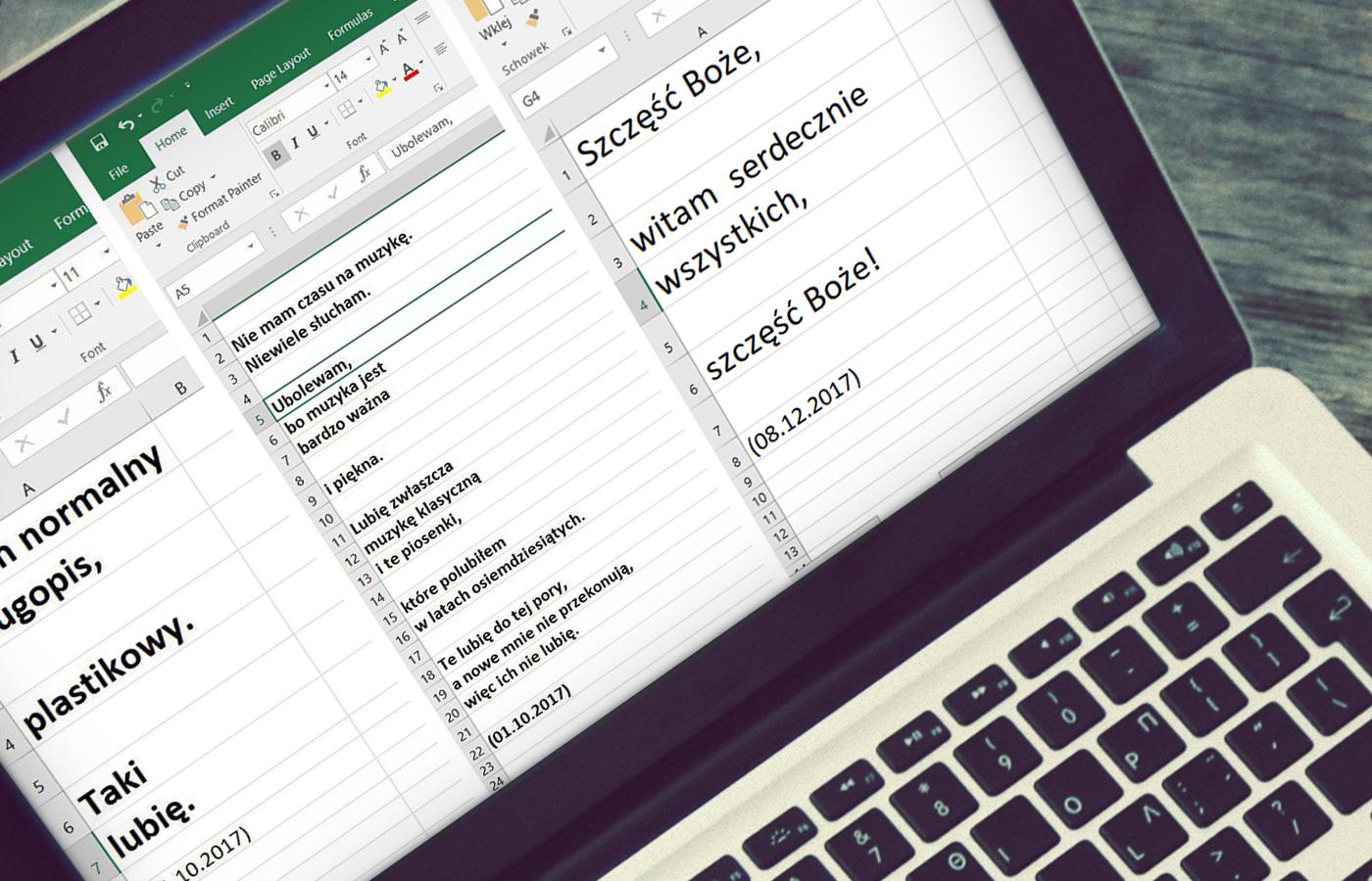 Morawiecki tymczasem zabiera głos po raz pierwszy w nowej roli. Udzielił m.in. wywiadu TV Trwam, ubolewając, że kościoły nie są pełne, i marząc o „rechrystianizacji Europy”. Ta i inne wypowiedzi są oczywiście komentowane, ale i twórczo przerabiane – na przykład na poezję. Na Facebooku powstał właśnie fanpage „Wiersze Mateusza Morawieckiego pisane w Excelu” (od lata działa też bliźniacza strona: „Wiersze Jarosława Kaczyńskiego pisane nocą”). Pierwszy wiersz jest ujmującą autocharakterystyką nowego premiera: