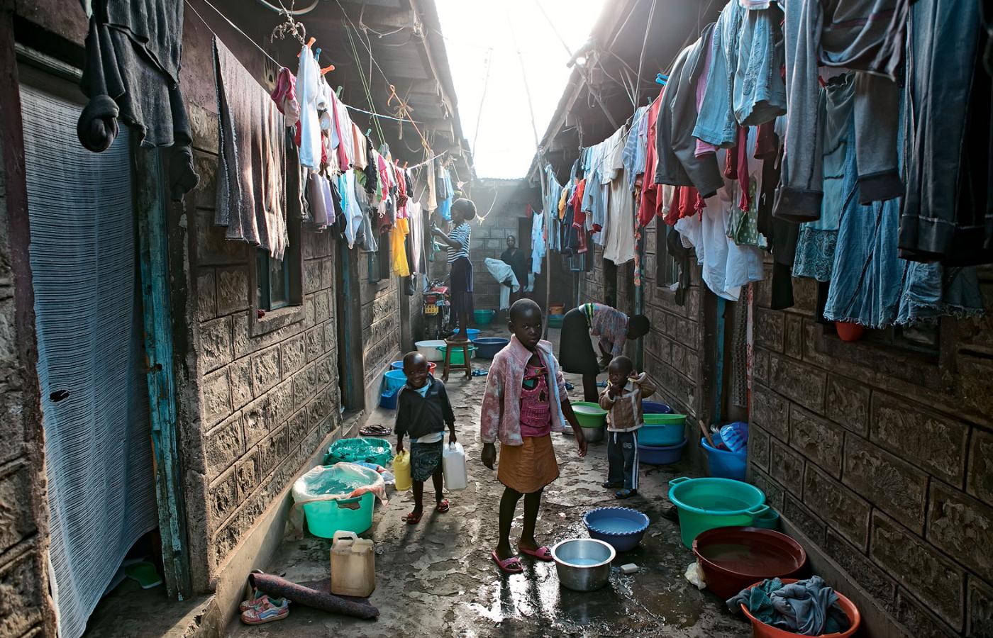 Boczna ścieżka biegnie w górę pomiędzy płotami z zardzewiałej blachy i domkami z glinianych cegieł. W tym, w którym mieszka Wiki, we wspólnym korytarzu dwie młode dziewczyny w jednej misce namydlają pranie szarym mydłem, by w drugiej je dokładnie wypłukać. Pralki w Korogocho nie ma nikt, a ubranie założone rano już w południe jest zakurzone i przesiąknięte dymem z wysypiska.