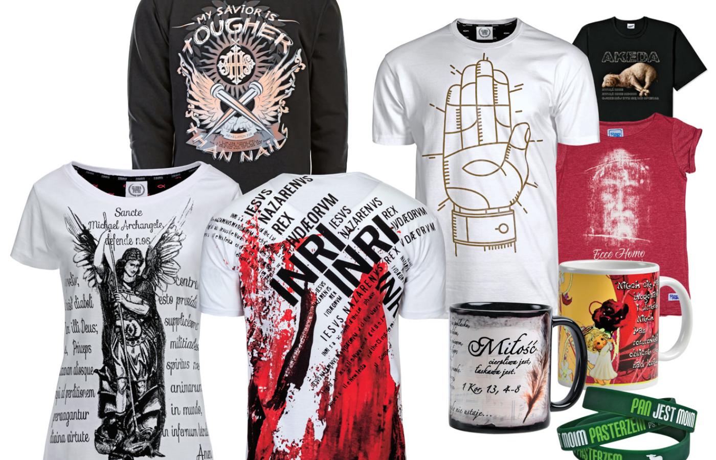 Niemowlęta mogą ewangelizować ubrane w body z „Jezus kocha swą małą owieczkę”, „Boża księżniczka” lub „Na rękach będą Cię nosić”. Ponadto: nerki zaprojektowane w roku miłosierdzia; fartuchy kuchenne; doskonałe w swej prostocie kubki „Jezu ufam Tobie” (porcelanowa powierzchnia zadowoli każdego klienta); czapki z daszkiem „Błogosław duszo moja Pana”; długopisy „Niech Cię błogosławi”; zeszyty na spirali „Pan jest moim pasterzem”; breloki „Jestem katolikiem, w razie zagrożenia życia wezwij księdza”; kubeczek z łyżeczką „Jeśli nie staniecie się jak dzieci, nie wejdziecie do Królestwa Niebieskiego”; bluzy ciążowe, świetnie układające się na sylwetce; worki na zakupy „Wykonało się”; boże krówki (100 g) oraz skarbonki świnki z aureolką „Dobrze zainwestowałem”.