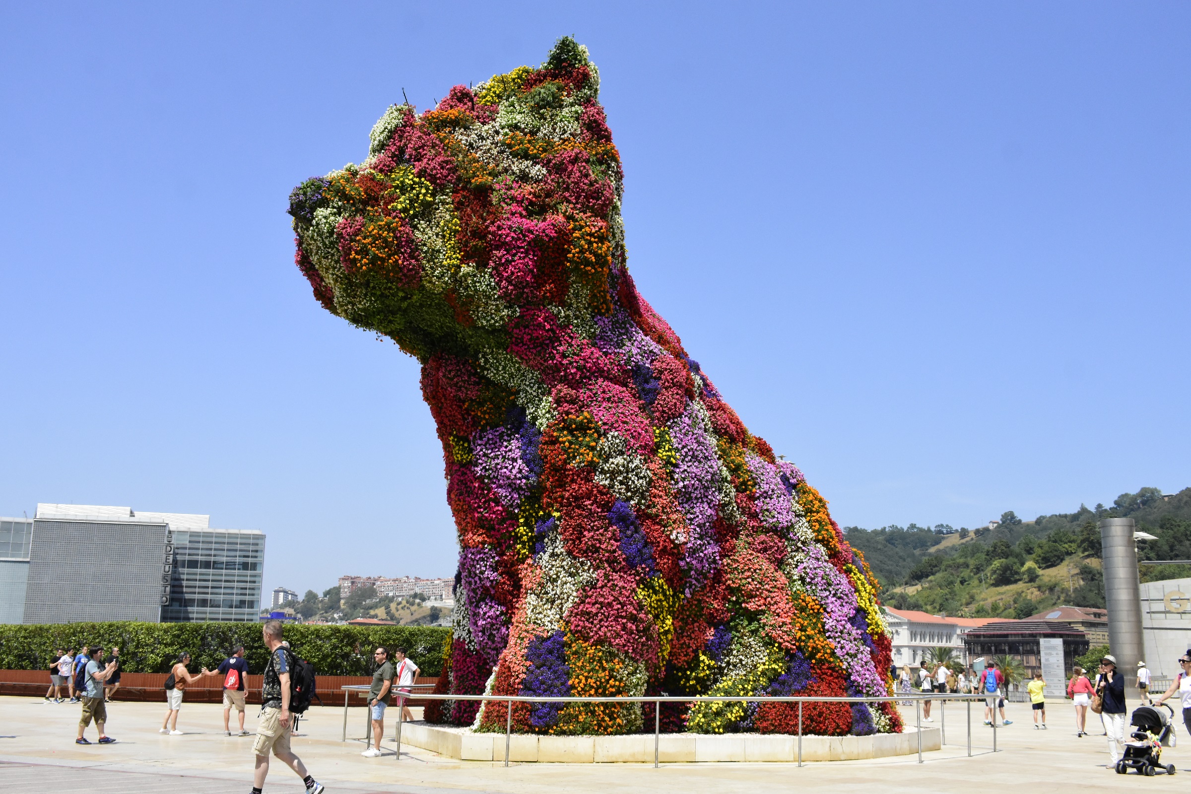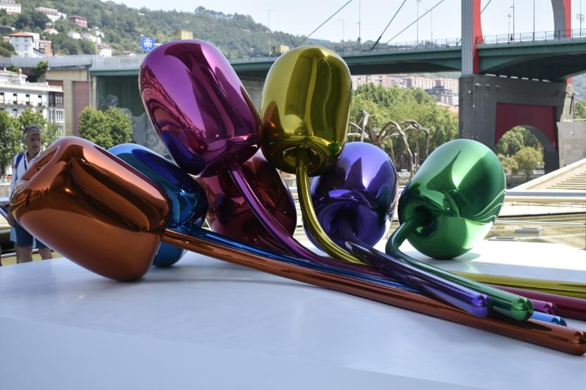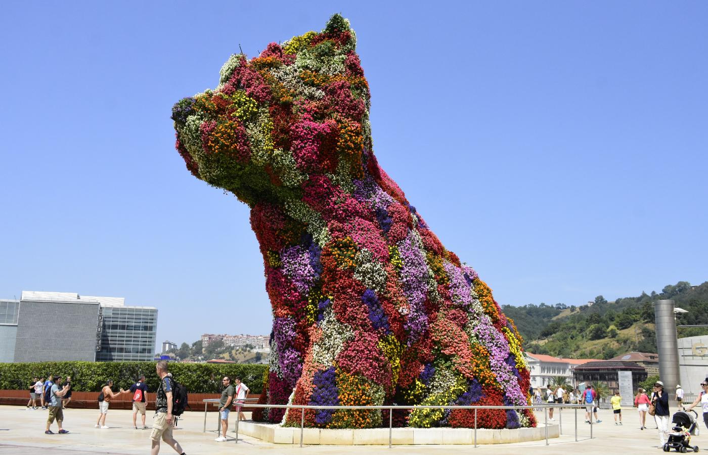Żeby dobrze przyjrzeć się bryle muzeum, najlepiej obejść je z różnych stron. Pomocne w tym okażą się również sąsiadujące z nim mosty. Znajdujący się po drugiej stronie muzeum most, nazywany ważką (ze względu na kształt widziany z góry) i łączący uniwersytet Deusto z drugim brzegiem rzeki, stanowi dobry punkt widokowy. Już z daleka zwraca uwagę gigantyczna rzeźba pająka stojąca obok budynku. Pająk autorstwa Louise Bourgeois nazywa się Mama i jest jedną z maskotek miasta. Kolejną z nich jest Puppy. Wykonany z 70 tys. kwiatów i wysoki na 12 m pies rasy west highland terrier jest dziełem artysty Jeffa Koonsa. Puppy zmienia swoje „umaszczenie” w ciągu roku. Zimą jest cały zielony, a na sezon wiosenny i lato pokrywa się kolorowymi kwiatami. Za nawadnianie kwiecistej sierści odpowiedzialny jest inteligentny system, który sprawia, że nadmiar wody zostaje wydalony przez psi pysk. Naprzeciwko Puppy'ego znajduje się kamienica, którą wielbiciele przygód Jamesa Bonda mogą znać z pierwszych minut filmu z Pierce'em Brosnanem „Świat to za mało”.