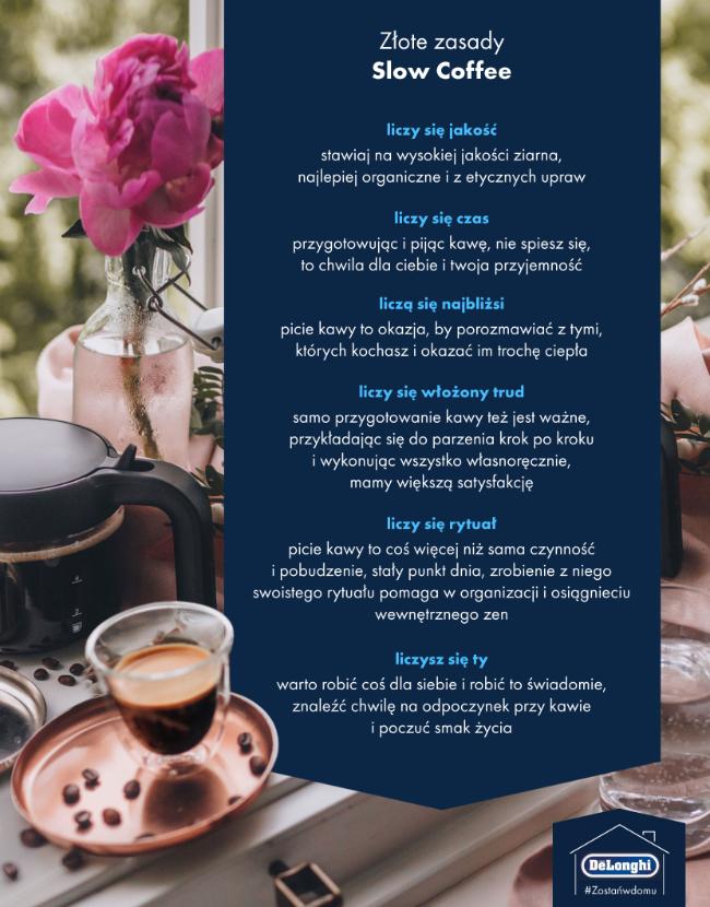 - do przygotowania kawy należy się przyłożyć – nawiązując do innego ruchu slow – slow food – miłośnicy slow coffee stawiają na powolne, tradycyjne przygotowanie. Picie kawy to także przyjemność jej parzenia, które stanowi rytuał sam w sobie. Warto się nim delektować, korzystając np. z ekspresu kolbowego – świeżo zmielone ziarna samodzielnie ubijać w kolbie, ręcznie pienić mleko. To daje dodatkowe poczucie satysfakcji i przyjemności z picia kawy.