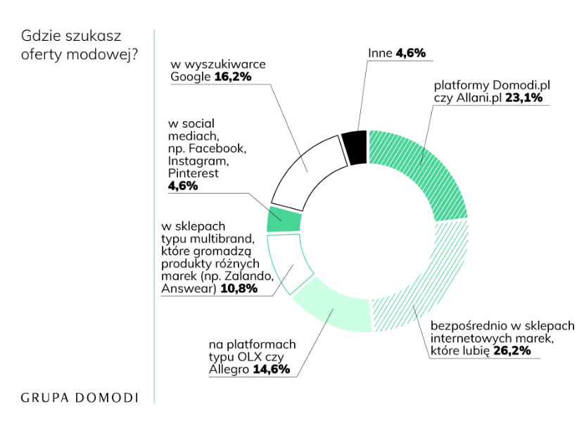 Okazuje się jednak, że nie dotyczy to branży modowej, w której wybór jest tak duży, że przeszukiwanie ofert sklepów internetowych może trwać godzinami. Mimo to, to właśnie bezpośrednie strony konkretnych marek cieszą się wciąż największą popularnością wśród Polaków. Do kupowania w sklepach internetowych ulubionych firm przyznaje się 26,6% ankietowanych. Na kolejnych miejscach uplasowały się z kolei popularne platformy typu marketplace (z Domodi czy Allani korzysta blisko 23% badanych) oraz e-sklepy multibrandowe, oferujące asortyment różnych marek (10,8%).