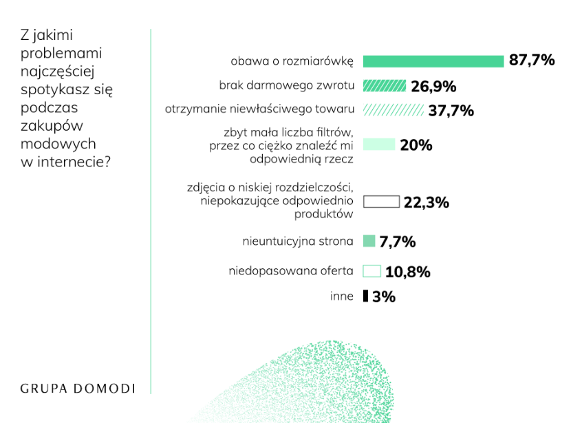 Zbyt mała liczba filtrów na stronach internetowych nie jest jednak głównym problemem napotykanym przez konsumentów w sklepach online. O wiele większym dylematem okazuje się obawa o rozmiarówkę, którą 87,7% ankietowanych uznaje za podstawowy minus e-zakupów w dziale z modą. Wysoko na liście problemów z zakupami w sieci pojawiły się też: brak darmowego zwrotu (26,9%) czy nieintuicyjna strona (7,7%).
