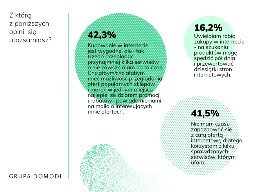 Co ciekawe, to właśnie internetowe strony marketplace czy sklepy multibrandowe są najlepszym sposobem na uniknięcie długich godzin spędzonych na poszukiwaniu w sieci, na które narzeka ponad 40% Polaków. Z badań wynika, że kupowalibyśmy ubrania przez Internet jeszcze chętniej, gdyby proces wyszukiwania interesujących nas ofert mógł przebiegać szybciej i sprawniej.
