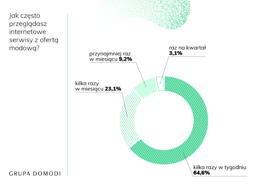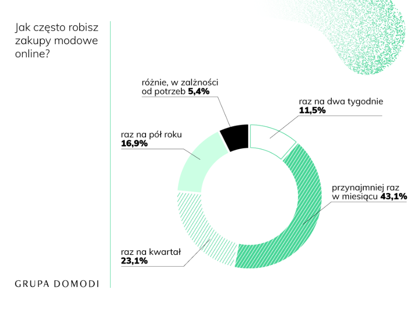 O tym, że Polacy coraz częściej kupują przez Internet mówi się od dawna. Odsetek konsumentów robiących zakupy w sieci co roku zwiększa się o kilka punktów procentowych, a pandemia i czas lockdownu z pewnością zadziałały w tym roku na korzyść e-handlu. Tym bardziej nie dziwi fakt, że aż 43,1% Polaków przyznaje, że zakupy modowe w sklepach internetowych robi co najmniej raz w miesiącu, a kolejne 11,5% - raz na dwa tygodnie.