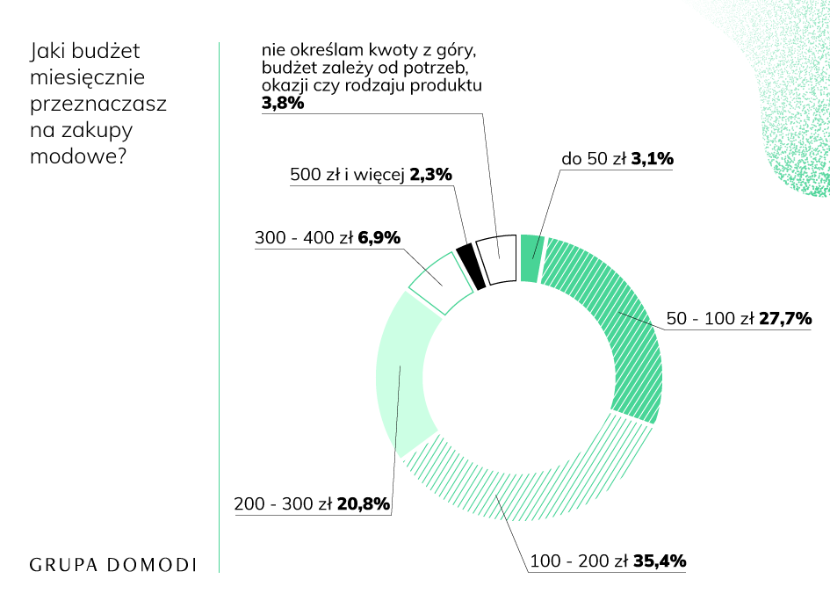 O ile wyniki dotyczące częstotliwości robienia zakupów przez Internet wskazują jednoznacznie na coraz większą popularność modowych platform e-commerce, o tyle przeznaczony na ubrania, buty czy dodatki budżet miesięczny jest najlepszym dowodem na to, że Polacy przy tego typu zakupach kierują się wciąż zdrowym rozsądkiem. 35,4% ankietowanych wydaje online na ubrania i dodatki od 100 do 200zł miesięcznie, 27,7% - od 50 do 100zł. A zaledwie 8,4% ankietowanych przyznaje się do wydatków powyżej 500zł.