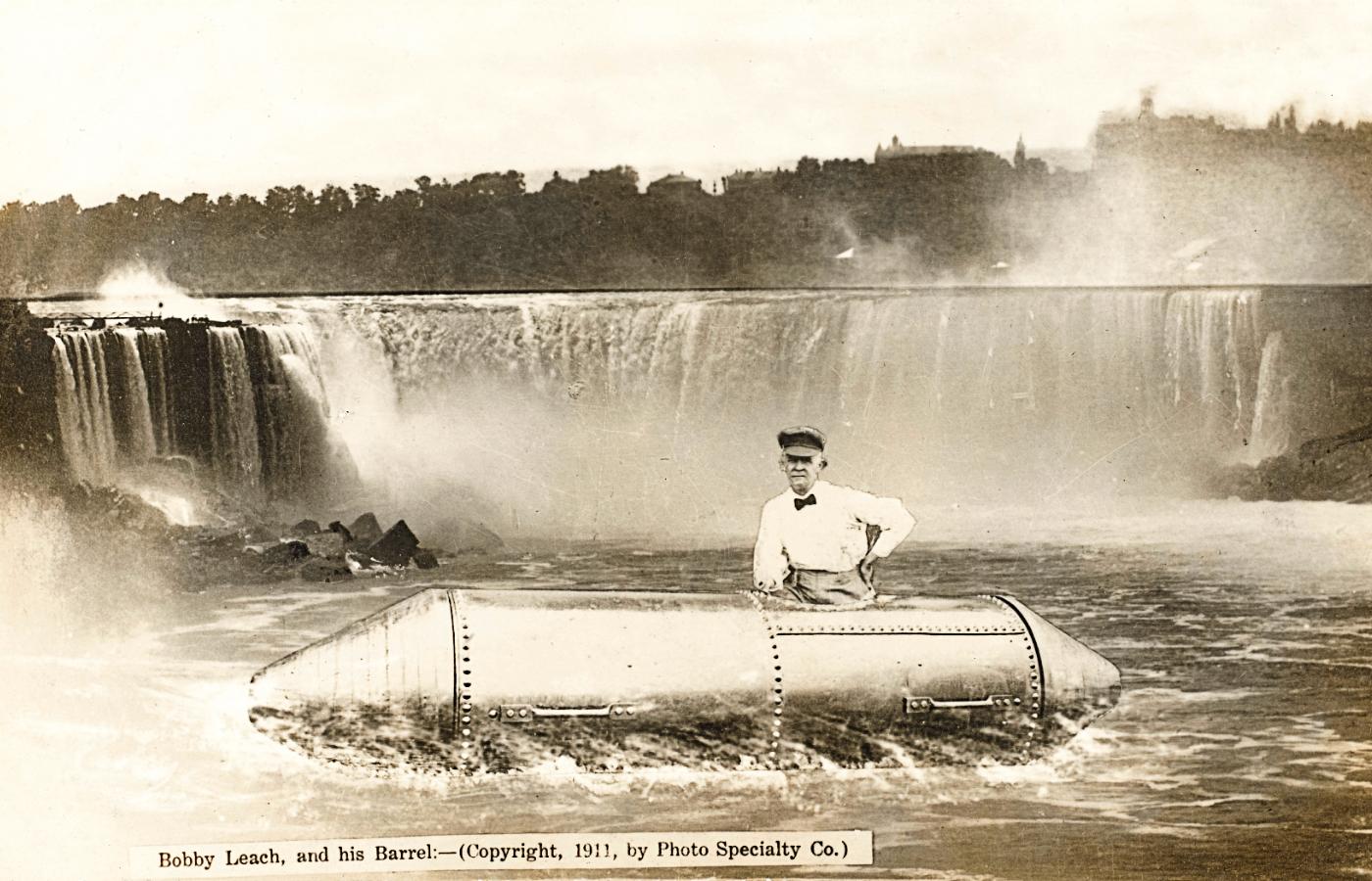 Mimo tłumu gapiów na brzegu kazał na siebie czekać ponad dwie godziny. Wreszcie, wyraźnie pod wpływem, wtoczył się do „beczki” – w rzeczywistości dwuipółmetrowego, stalowego cylindra przypominającego cygaro – i popłynął w kierunku 53-metrowej kaskady. Nie wszystko poszło zgodnie z planem – Leacha musiał uratować inny „daredevil” William „Red” Hill Sr.
