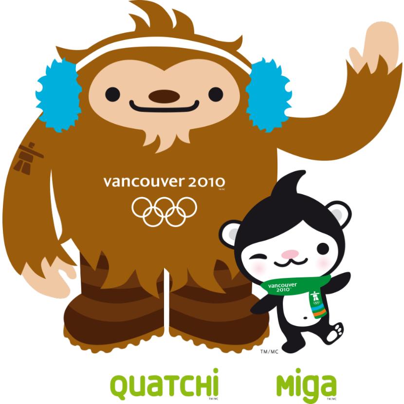 W Vancouver w 2010 r. spróbowano czegoś delikatnie nowego – maskotki nawiązywały do miejscowej mitologii. Sasquatch, czyli – powiedzmy – północnoamerykański yeti, miał na imię Quatch i nosił nauszniki. Miga to zaś mityczny niedźwiedź morski, w połowie orka, w połowie biały niedźwiedź. Od czasu do czasu towarzyszyła im maskotka nieoficjalna – świstak Mukmuk.