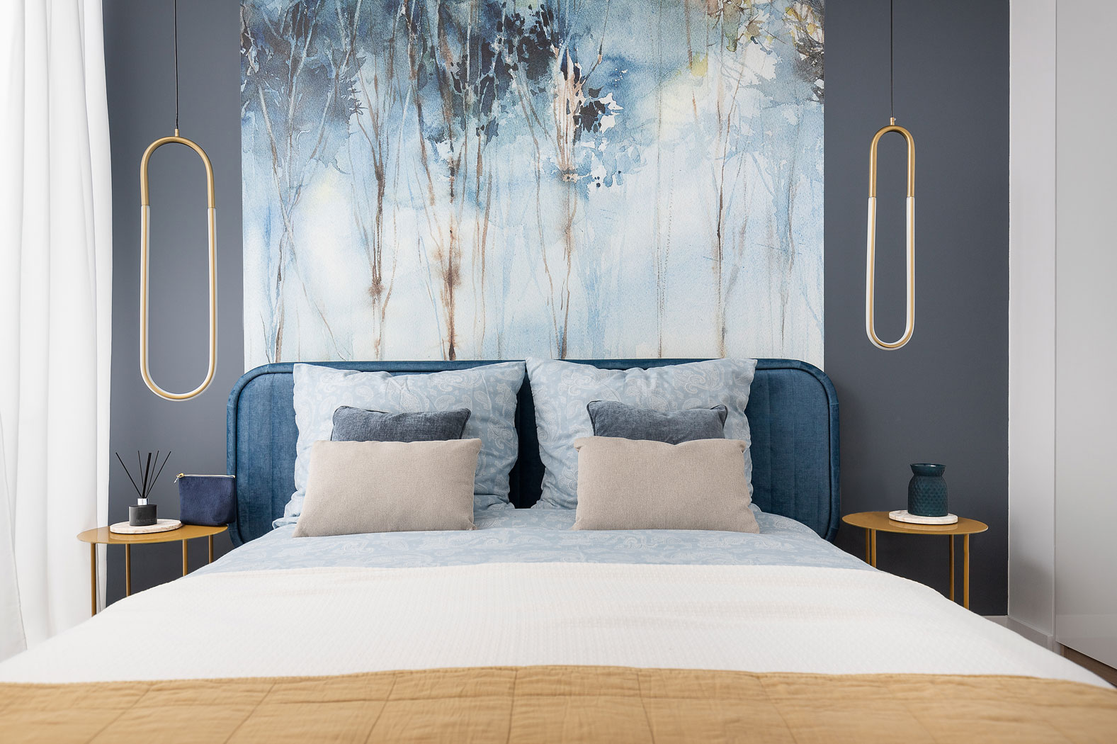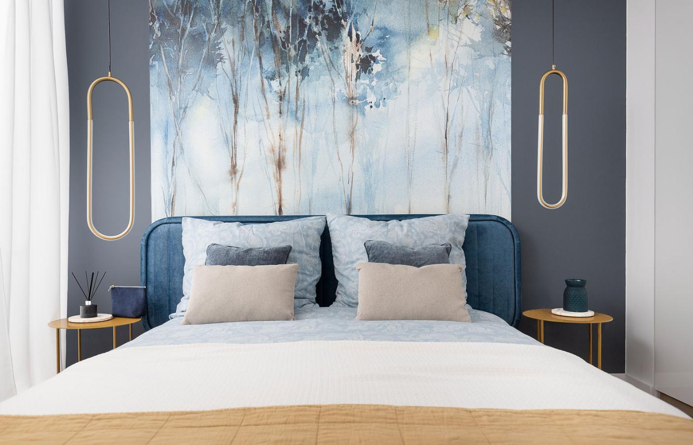Według Anny Czub, dyrektor generalnej Galerie Venis, możliwości, jakie dają projektantowi tapety, są nie do przecenienia. – Spójrzmy na tę błękitno-beżową – mówi, pokazując wzór Karelia marki Wonderwall, przypominający drzewa rosnące nad wodą. – Tapeta definiuje wnętrze i stanowi wskazówkę dla dalszych wyborów. W tym przypadku połączona została z dębową podłogą, ciemną zabudową, złotymi lampami.