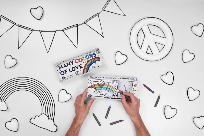 Co oznacza Many Colors of Love? Przede wszystkim możliwości swobodnej ekspresji uczuć. Dlatego Many Mornings specjalnie na miesiąc dumy zaprojektowało PRIDE BOX. To pudełko prezentowe, którym możesz obdarować wszystkich, których kochasz (w tym także siebie). Zawiera kolorowe skarpetki «Over the Rainbow», okolicznościowe vlepki oraz kredki. To właśnie ostatni element zestawu jest kluczowy, ponieważ PRIDE BOX jest jednocześnie kolorowanką. Każdy użytkownik może je pomalować w barwy swojej tożsamości. To zaproszenie do ekspresji twórczej i opowiedzenia historii o sobie; zaproszenie dobroczynne - bowiem 100% zysku ze sprzedaży PRIDE BOXU trafia do Grupy Stonewall, która wspiera pełne społeczne włączenie osób LGBT+.