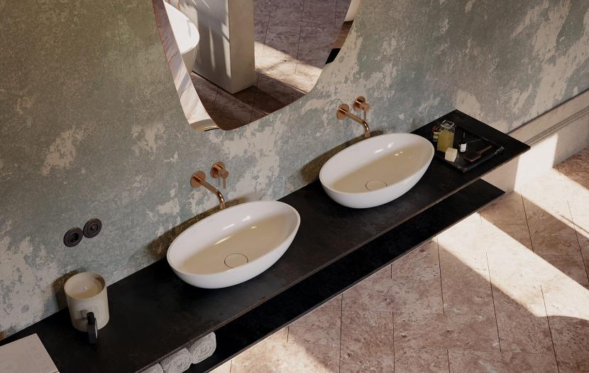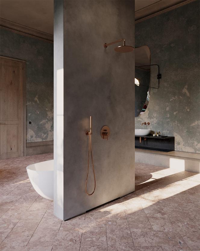Z powierzchniami utrzymanymi w neutralnej, chłodnej tonacji doskonale komponuje się armatura z kolekcji OMNIRES Y o ciepłej, czerwonobrązowej barwie miedzi szczotkowanej. Powłoka została wykonana w zaawansowanej technologii PVD - gwarantuje to najwyższą trwałość i odporność na uszkodzenia, zapewniając jednocześnie łatwość w czyszczeniu.