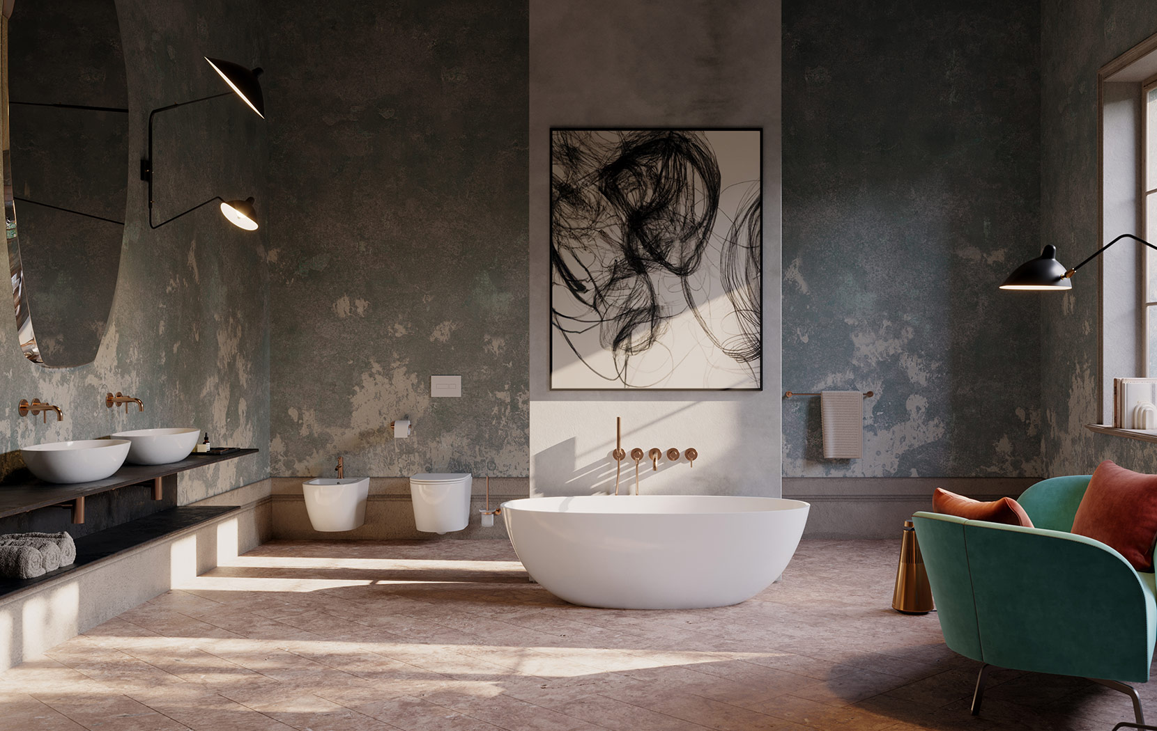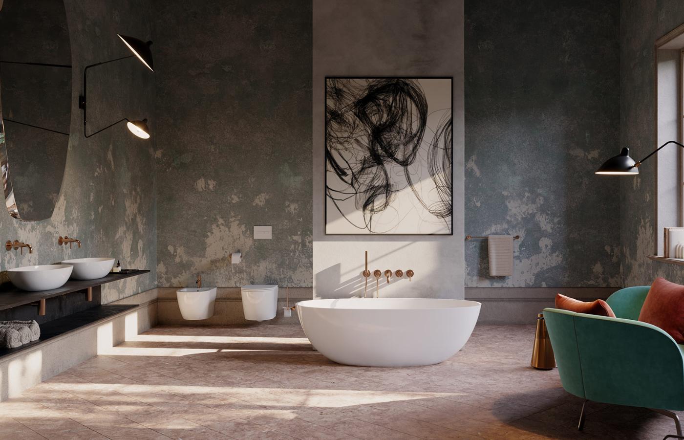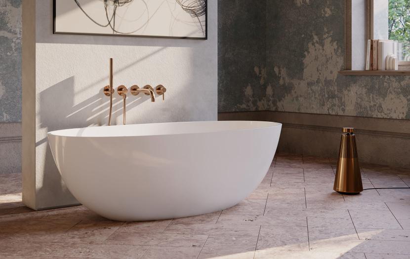 Ważną rolę w łazience w stylu Eclectic Heritage odgrywa również ustawiona centralnie wolnostojąca wanna. Jej miękka, eliptyczna bryła tworzy efekt wyrzeźbionego ze skały monolitu o idealnych proporcjach.