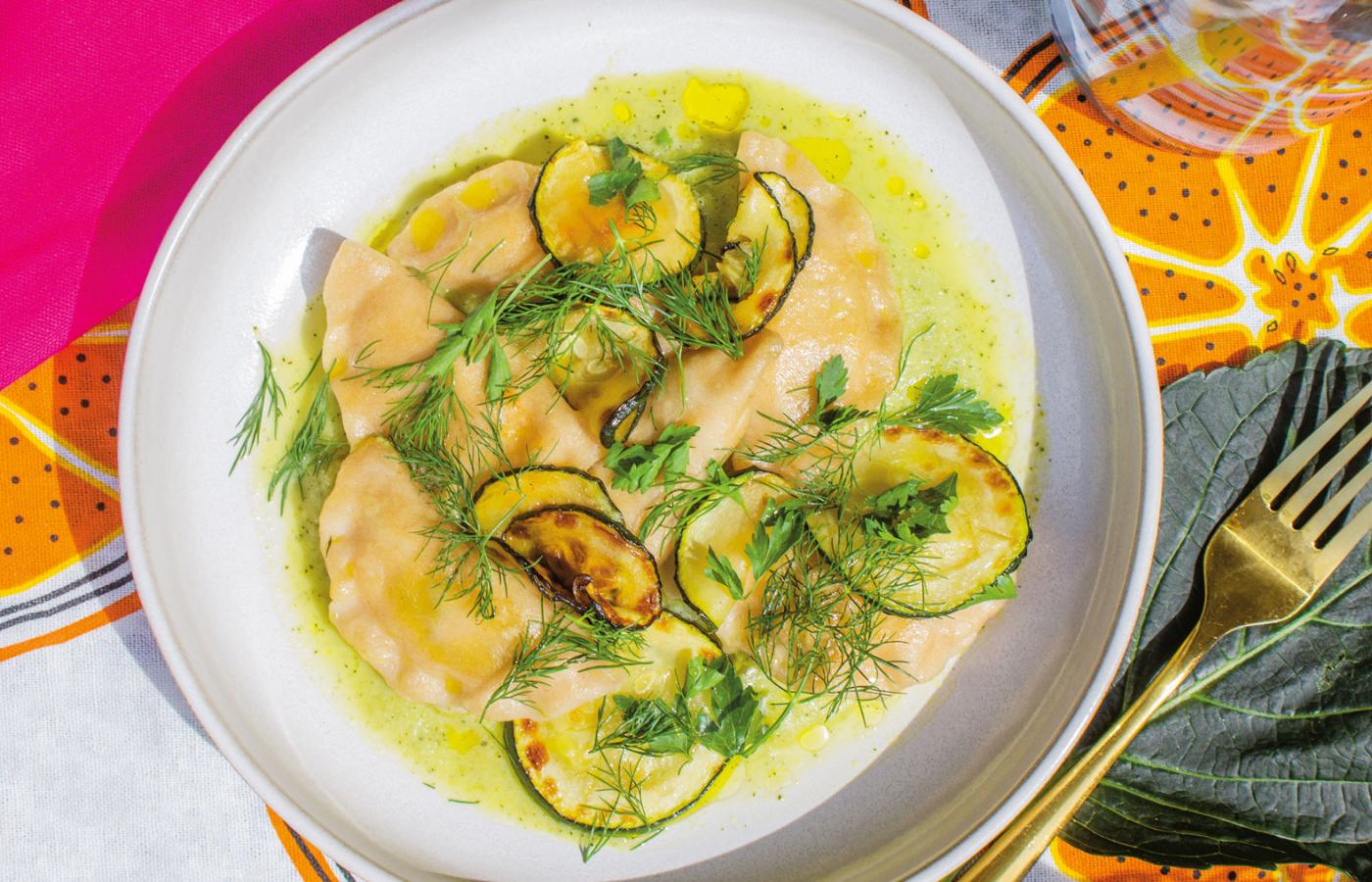 Orkiszowe pierożki z farszem z tofu i szparagów w sosie cukiniowo-cytrynowym: