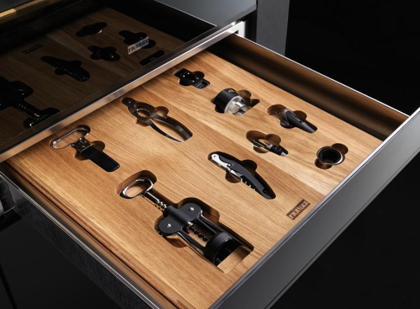 Ciekawą propozycją są specjalistyczne szuflady AGD montowane pod ekspresem do kawy lub winiarką. W każdej z nich znajdziemy organizer wykonany z drewna dębowego, który jest dostosowany do przechowywania akcesoriów niezbędnych do serwowania kawy czy wina. Dzięki pojemnikom na ziarna kawy można przechowywać i utrzymać świeżość swoich ulubionych gatunków lub mieszanek. Dołączony zestaw do latte art pozwala na wyrażenie swojej kreatywności poprzez tworzenie pięknych wzorów. Przewidziano także specjalne pojemniki na liście herbaty. Natomiast szuflada przeznaczona pod winiarkę zawiera niezbędne akcesoria, takie jak otwieracze do butelek, korkociągi i korki, np. do szampana.