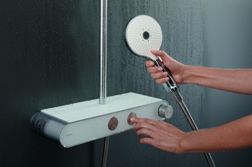 Zintegrowany zestaw prysznicowy termostatyczny all – in- one z półką zachwyca nowoczesnym designem, możliwością ustawienia indywidualnych opcji prysznicowych oraz praktyczną przestrzenią do przechowywania. Shower Shelf System można indywidualnie łączyć z różnymi seriami baterii firmy Duravit, co doskonale uzupełni wystrój każdej łazienki. Atrakcyjna wizualnie i funkcjonalna obudowa termostatu z odporną na zarysowania szklaną powierzchnią pełni jednocześnie funkcję półki na przybory prysznicowe. Użytkownicy mogą wybierać pomiędzy słuchawką prysznicową a deszczownicą w zależności od swoich preferencji. Obsługa systemu prysznicowego odbywa się za pomocą trzech pokręteł z teksturowanymi uchwytami. Dwa wysuwane pokrętła regulują przepływ wody oraz rodzaj strumienia (deszczownica lub słuchawka prysznicowa), natomiast temperaturę ustawia się za pomocą oddzielnego uchwytu termostatu. Technologia Click! umożliwia łatwy wybór trzech rodzajów strumienia w słuchawce prysznicowej: Rain charakteryzuje się równomiernie rozłożonym, obfitym i przypominającym deszcz strumieniem prysznicowym, który dostarcza optymalną ilość wody np. do mycia włosów. Pulse to orzeźwiający strumień wody o działaniu witalizującym, a Mono to ukierunkowany strumień indywidualny, który przyjemnie rozluźnia mięśnie. Shower Shelf System jest opcjonalnie dostępny w wariancie oszczędzającym wodę MinusFlow (przepływ w słuchawce prysznicowej wynosi minus 40 procent i minus 60 procent w deszczownicy). Bateria termostatyczna jest standardowo wyposażona w technologię HeatLock, chroniącą przed poparzeniem, a dysze prysznicowe w system EasyClean ułatwiające czyszczenie. Kamień i brud można po prostu zetrzeć palcem, bez konieczności stosowania dodatkowych detergentów. Duravit udziela pięcioletniej gwarancji na wszystkie baterie i 15-letniej gwarancji dostępności części zamiennych.