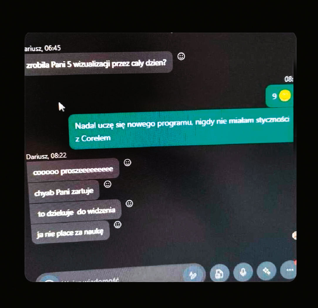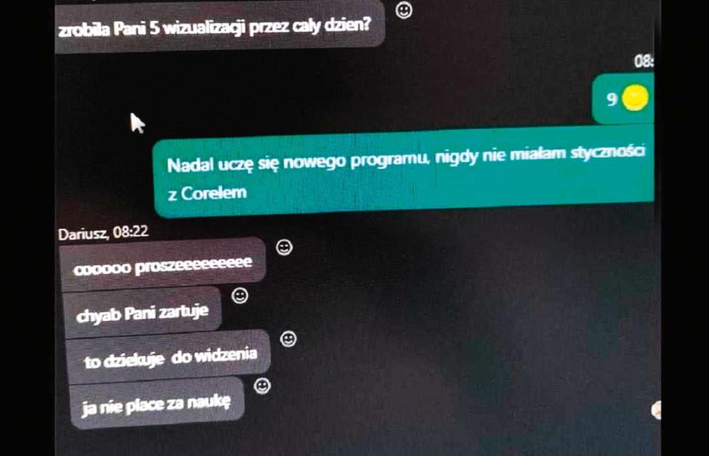 Zwolnienie nowej pracownicy przez komunikator internetowy obnażyło folwarczne stosunki panujące w polskich firemkach. A było tak: 14 marca 2024 r. młoda graficzka umieściła w serwisie X zdjęcie ekranu komputera, na którym widniała jej korespondencja z szefem. Drugiego dnia pracy na ogólnym firmowym czacie krewki przedsiębiorca wyraził zdumienie, że nie wyrobiła normy (dziewięć projektów zamiast piętnastu, jak doświadczeni pracownicy). Kobieta wyjaśniła, że dopiero się uczy programu Corel (na rozmowie o pracę informowała, że ma doświadczenie w korzystaniu z pakietu Adobe, branżowego standardu), na co szef oświadczył, że „nie płaci za naukę”, i ją zwolnił.