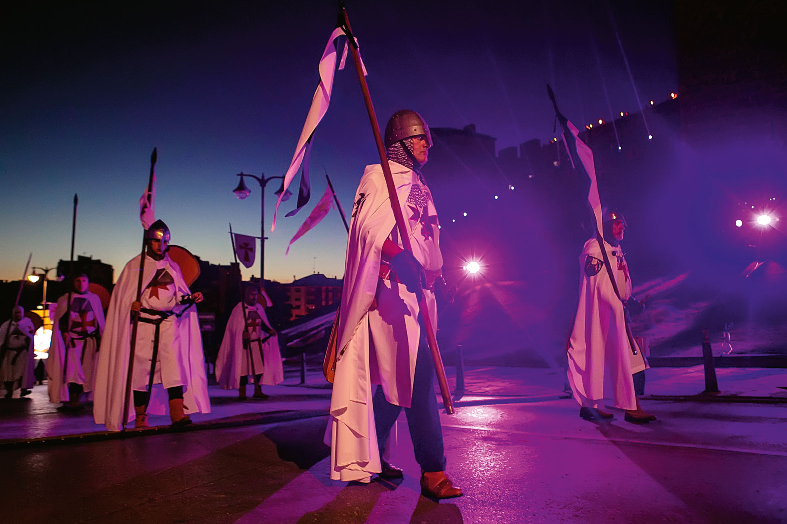Zamek zawsze był obecny w naszych zabawach i dziecięcych potyczkach – wspomina Amalita Ruiz, legendarna w regionie Bierzo spikerka radiowa, która w 2023 r. przyjęła honorowy tytuł Mistrzyni Stowarzyszenia Przyjaciół Nocy Templariuszy w Ponferradzie. Urodziła się i wychowała w cieniu twierdzy z XII w. Gdy przemawia na dziedzińcu, głos drży jej ze wzruszenia. Przed nią w czerwonawym świetle lamp stoją początkujący bracia-rycerze, wszyscy ubrani w białe płaszcze z kapturami i tuniki z czerwonym krzyżem na piersi. Za chwilę do zakonu przystąpi 80 adeptów pasowanych przez samego Guida de Gardę – legendarnego mistrza templariuszy sprzed wieków. A raczej jego współczesne wcielenie.